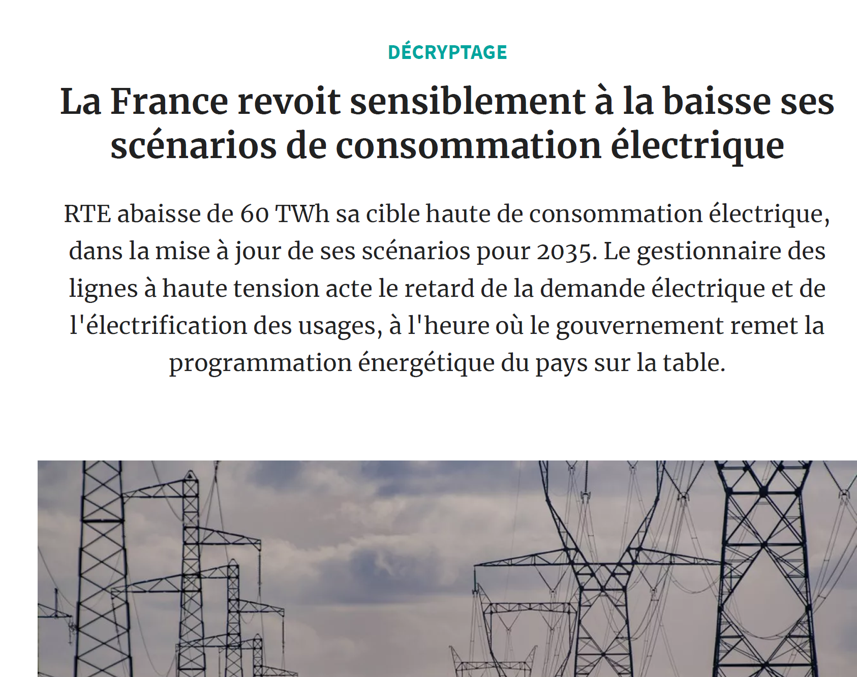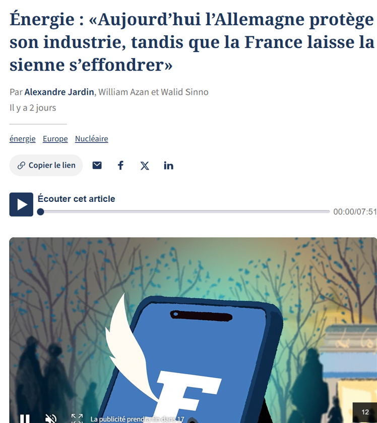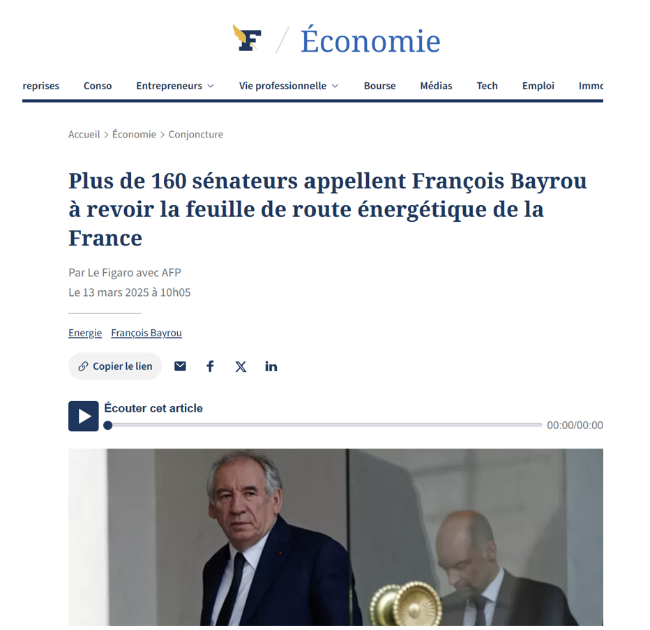 10) PPE3 : Mobilisation entrainée par l'Académie des Sciences contre un décret et un texte absurdes : La charge de l'Académie des sciences contre la PPE3: mépris des experts, chiffrages incohérents, surestimation absurde de la demande électrique, les dangers de l'augmentation massive des énergies solaires et intermittentes… la fuite en avant des renouvelables et un décret illégal pour accélérer sur l'éolien en mer. L'Académie des sciences a été entendue et provoque un vif débat chez les décideurs et l'opinion publique, dans nous espérons qu'il arrivera à sa conclusion logique : un moratoire immédiat sur les énergies fatales intermittentes. Il est incompréhensible que les objectifs de production électrique totale ne tiennent pas compte, à travers des scénarios alternatifs, de la réalité suivante : depuis 2017, la consommation électrique diminue globalement, passant de 480 à 449 TWh en 2024, en contradiction avec les prévisions… Avec des besoins en électricité de 508 TWh en 2035, aucune capacité supplémentaire de production électrique ne serait alors nécessaire, la production actuelle étant suffisante. Pourquoi, alors, envisager 200 TWh d'énergies renouvelables (EnR) supplémentaires… Plus inquiétant encore, cette production repose principalement sur une augmentation massive des énergies solaire et éolienne intermittentes, passant de 73 TWh en 2023 à 254-274 TWh en 2035. Cette évolution entraînerait des surcapacités considérables, coûteuses et inutiles, générant un excédent d'offre par rapport à la demande dépassant les 100 TWh, et surtout un taux excessif de production d'électricité non pilotable proche de 40 %. Lien :