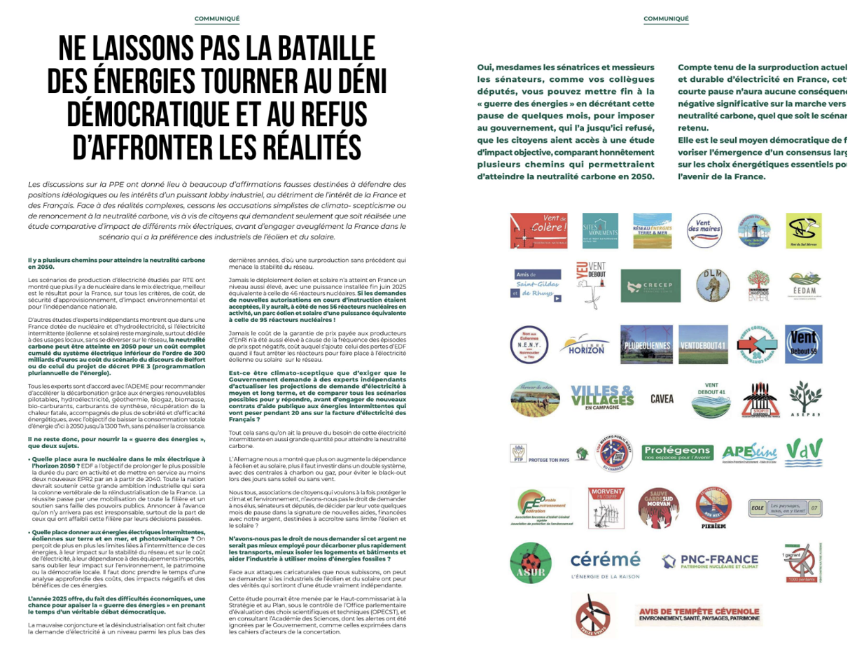 3) PNC France : la publication d'un décret PPE3 constituerait un déni démocratique et une erreur en terme de politique énergétique : « Il appartient au Parlement d'établir et de voter les textes législatifs, et il serait inacceptable que, cédant à des intérêts privés, des services de l'État contournent ainsi son rôle. Cela serait gravement dommageable pour la France et les Français, car il est démontré que le projet actuel de PPE3 comporte des aberrations qui demandent impérativement à être corrigées. Quels que soient les arguments fallacieux et intéressés des lobbies du gaz et des énergies renouvelables, il est établi que le développement massif des sources d'énergie éolienne et photovoltaïque proposé à court terme par le projet actuel ne répond à aucun besoin et est ruineux pour l'économie française et les consommateurs. Dans la situation économique de la France, avec 3400 milliards de dettes, il convient d'écarter tout engagement financier non indispensable. Lien