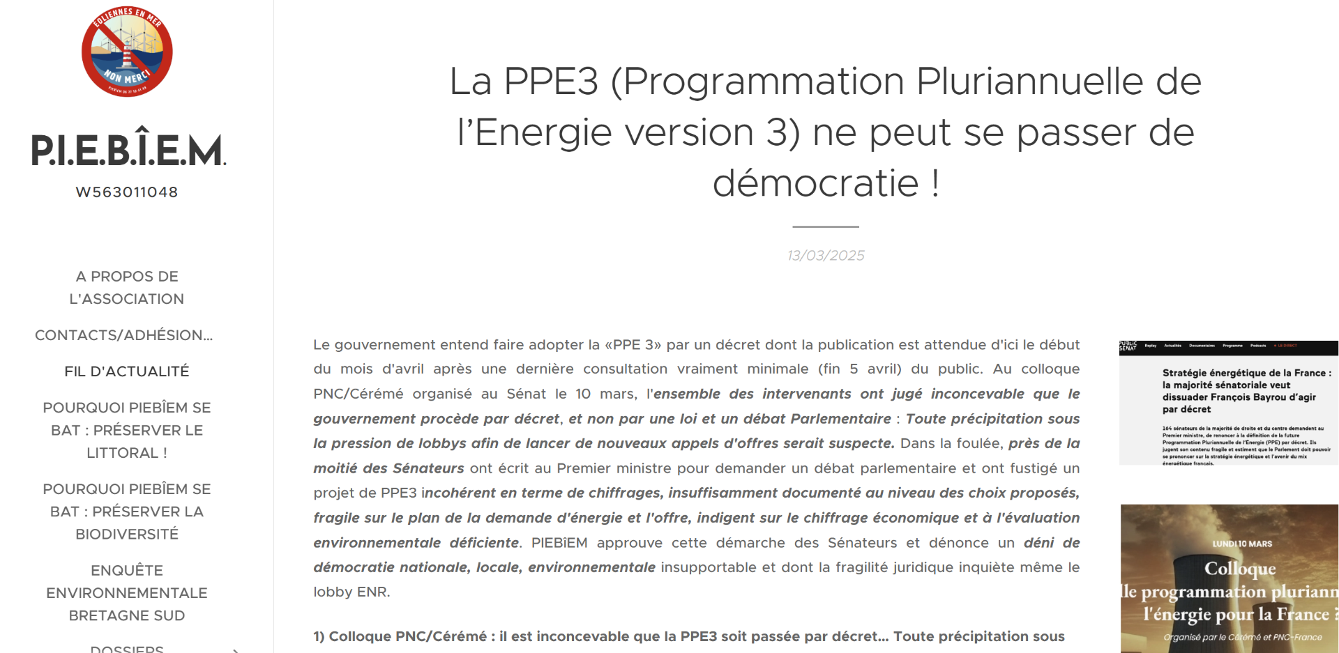11) La PPE3 (Programmation Pluriannuelle de l'Energie version 3) ne peut se passer de démocratie ! Le gouvernement entend faire adopter la «PPE 3» par un décret dont la publication est attendue d'ici le début du mois d'avril après une dernière consultation vraiment minimale (fin 5 avril) du public. Au colloque PNC/Cérémé organisé au Sénat le 10 mars, l'ensemble des intervenants ont jugé inconcevable que le gouvernement procède par décret, et non par une loi et un débat Parlementaire : Toute précipitation sous la pression de lobbys afin de lancer de nouveaux appels d'offres serait suspecte. Dans la foulée, près de la moitié des Sénateurs ont écrit au Premier ministre pour demander un débat parlementaire et ont fustigé un projet de PPE3 incohérent en terme de chiffrages, insuffisamment documenté au niveau des choix proposés, fragile sur le plan de la demande d'énergie et l'offre, indigent sur le chiffrage économique et à l'évaluation environnementale déficiente. PIEBîEM approuve cette démarche des Sénateurs et dénonce un déni de démocratie nationale, locale, environnementale insupportable et dont la fragilité juridique inquiète même le lobby ENR. Lien