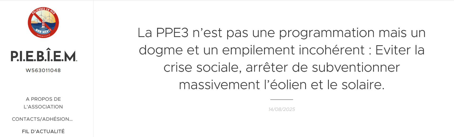 6) La PPE3 n'est pas une programmation mais un dogme et un empilement incohérent : Eviter la crise sociale : Dans Le Figaro (13 août), Alexandre Jardin, F Bellamy, D. Lisnard... invitent à remettre radicalement en cause une PPE3 qui présente un danger grave de crise sociale, dénoncent une logique de subventions massives (on produit à perte, on vend à perte, et ce sont les factures des citoyens fragilisés qui compensent) et appellent à la fin de tout financement public pour l'éolien et le solaire. 2) Yves d'Amécourt ( Nouvelle Energie) considère que la PPE3 n'est pas une programmation mais un dogme et est à reprendre intégralement, qu'il faut arrêter cet empilement incohérent en l'absence de stratégie et de subventionner massivement pour produire encore plus, au mauvais moment, au mauvais endroit, au mauvais prix.» lien :