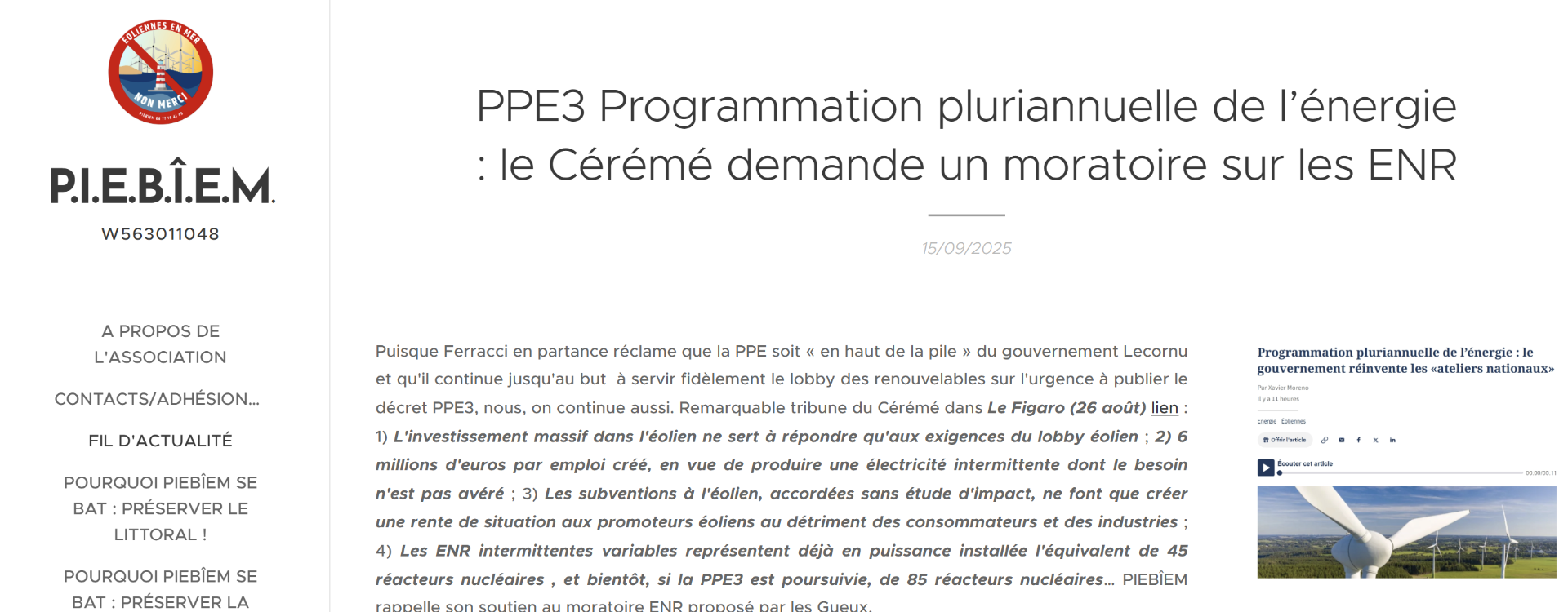 7) PPE3 Tribune du Cérémé cosignée PIEBÎEM : ne laissons pas la bataille des énergies tourner au déni démocratique ou comment gagner facilement 300 milliards d'euros : Si l'électricité intermittente (éolienne et solaire) reste marginale, surtout dédiée à des usages locaux, sans se déverser sur le réseau, la neutralité carbone peut être atteinte en 2050 pour un coût complet cumulé du système électrique inférieur de l'ordre de 300 milliards d'euros au coût du scénario du discours de Belfort ou de celui du projet de décret PPE 3 . Un parc éolien et solaire installé plus puissant que le nucléaire- inutile et à coût exorbitant : « Jamais le déploiement éolien et solaire n'a atteint en France un niveau aussi élevé, avec une puissance installée fin juin 2025 équivalente à celle de 46 réacteurs nucléaires. Si les demandes de nouvelles autorisations en cours d'instruction étaient acceptées, il y aurait, à côté de nos 56 réacteurs nucléaires en activité, un parc éolien et solaire d'une puissance équivalente à celle de 95 réacteurs nucléaires… lien