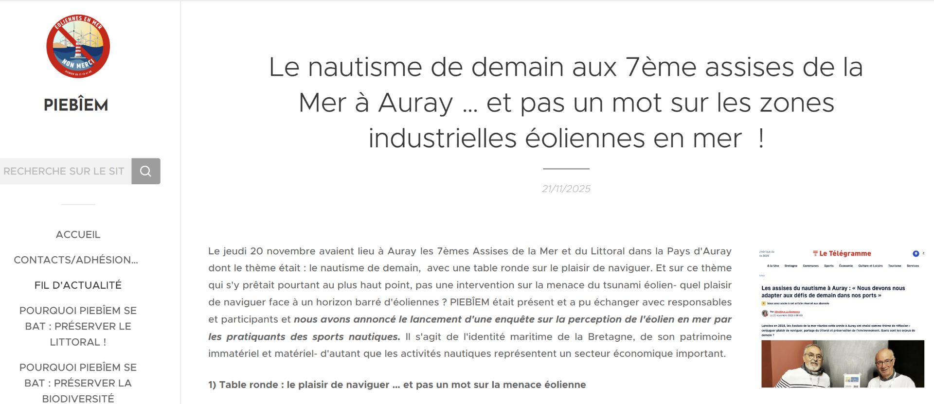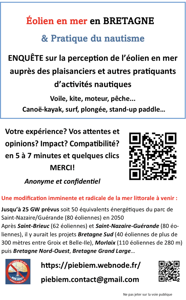 En novembre 2025, lors des 7ème assises de la Mer du Pays d'Auray et du Paris Nautic Show, PIEBÎEM avait dénoncé le grand silence autour des zones éoliennes en mer et des conflits d'usage évidents avec le nautisme, sans même parler du plaisir de slalomer entre les zones éoliennes et des horizons perdus. A l'occasion du SPI Ouest-France, PIEBÎEM rappelle quelques prises de position du milieu du nautisme dans les débats récents et le lancement d'une enquête sur la perception de l'éolien en mer (déja installé ou en projet) par les pratiquants et professionnels des sports nautiques. Lien
