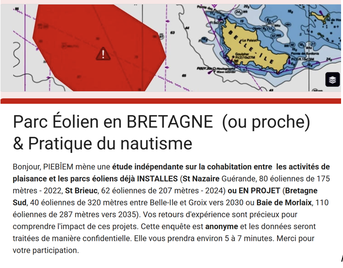 PIEBÎEM lance donc une enquête sur la perception de l'éolien en mer (déja installé ou en projet) par les pratiquants et professionnels des sports nautiques. Nous souhaiterions recueillir votre avis en tant que professionnel du secteur et/ou pratiquant. La réponse prendra environ 5 à 7 minutes