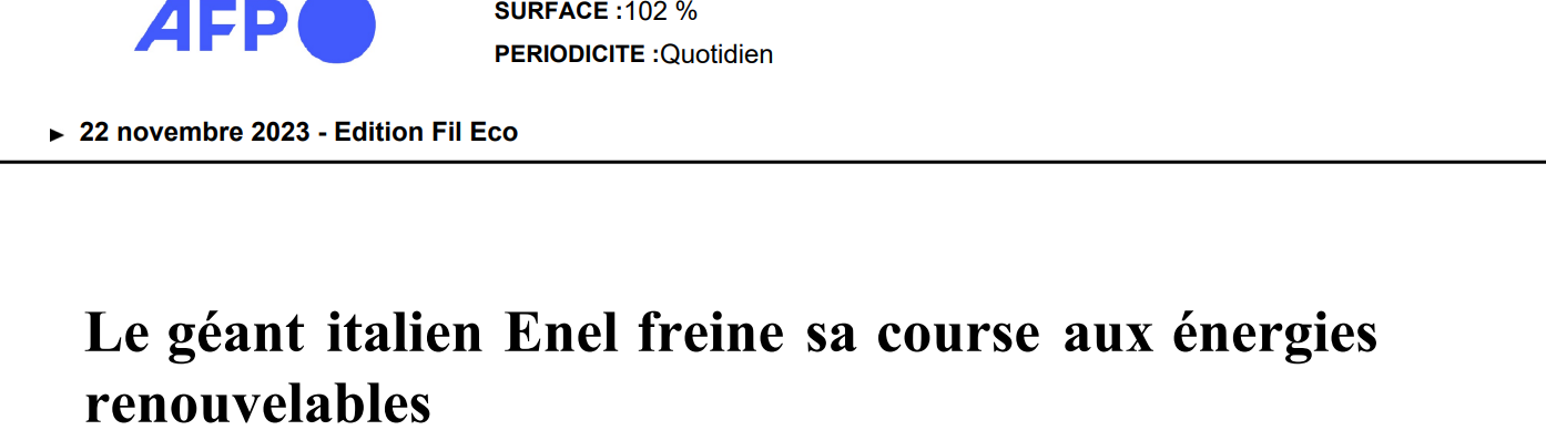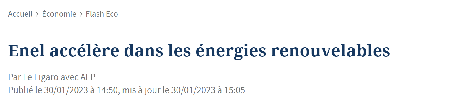 Enel, 22 novembre 2033 : le géant italien Enel freine sa course aux énergies renouvelables / Enel , 30 janvier 2023 : ENEL accélère dans les énergies renouvelables.