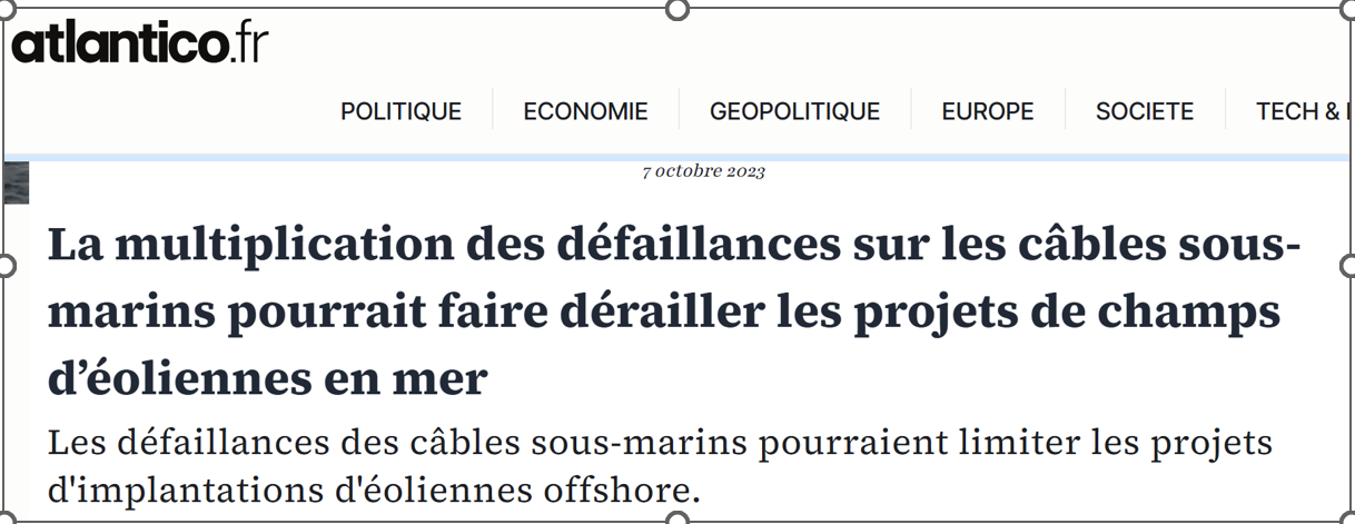 2) Dommages causés aux câbles : « On estime que 70 % des pannes de câbles sont causées par des dommages liés aux activités maritimes, à la pêche ou à la navigation, accidentelles ou non. En raison de leur emplacement éloigné et difficile à surveiller, les pannes de câbles peuvent faire l'objet d'actes criminels, d'actes terroristes et d'activités intermédiaires. L'armée russe utilise la Direction principale des recherches océaniques (GUGI) pour la collecte de renseignements en eaux profondes, comme la cartographie de l'emplacement des parcs éoliens offshore ou des points d'arrivée des câbles à terre, et pour des opérations de sabotage » PIEBÎEM : Ce n'est pas pour rien. La rupture brutale de la production par plein vent d'une zone éolienne industrielle peut provoquer un effondrement plus ou moins localisé du réseau. lien
