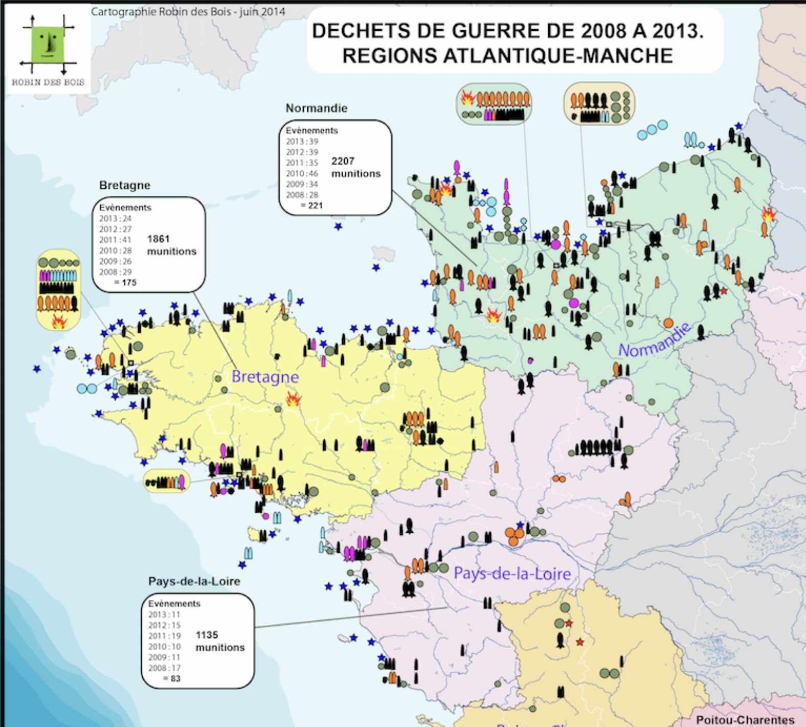 7) Munitions non explosées sur les fonds marins : « Des explosifs, des munitions chimiques, des bombes et des obus d'artillerie ont été immergés pendant et après les deux guerres mondiales, et il reste encore aujourd'hui des centaines de milliers de munitions non explosées dans les mers européennes… Les munitions non explosées qui gisent au fond de la mer constituent une menace sérieuse pour la vie marine et humaine pendant la construction et l'exploitation des parcs éoliens offshore. Elles doivent être éliminées à l'aide de technologies silencieuses (moins bruyantes que les détonations « de haut niveau ») pour que les projets éoliens puissent se poursuivre. «