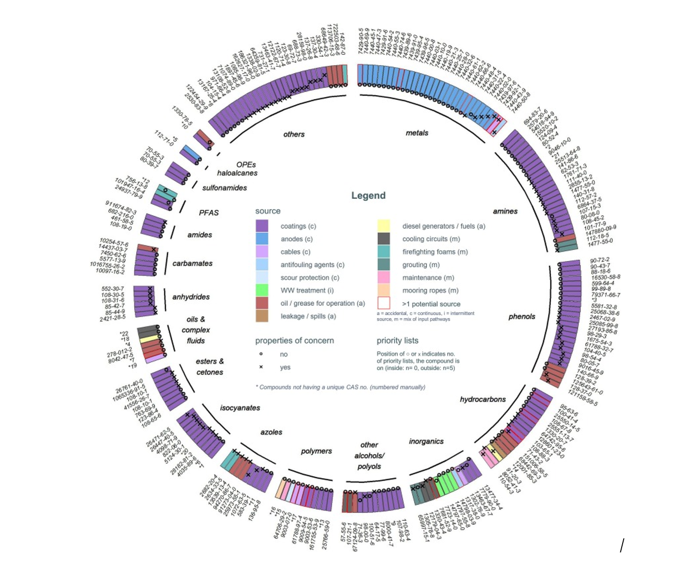 PIEBÎEM : Sur cette question, voir notre recension sur la publication de l'Ifremer lien https://piebiem.webnode.fr/l/pollution-par-les-parcs-eolien-en-mer-le-diagnostic-inquietant-de-l-ifremer/ qui recense au moins 228 substances chimiques relarguées par les zones éoliennes en mer dont 25 cancérigènes/mutagènes, 17 reprotoxiques, 93 toxiques pour l'environnement aquatique, 14 perturbateurs endocriniens. lien