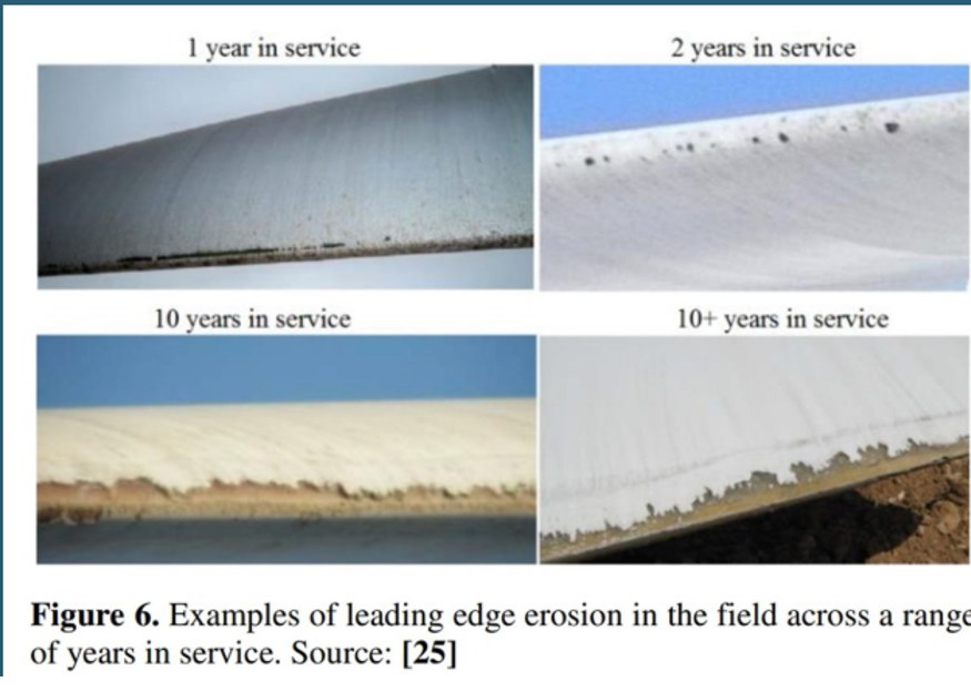 Cette « érosion du bord d'attaque » devient de plus en plus problématique à mesure que les pales s'allongent et que la vitesse en bout de pale augmente, et donc les impacts. Au cours du processus d'érosion du bord d'attaque, des particules de plastique sont libérées dans l'environnement, un phénomène qui commence seulement à faire l'objet de recherches. Une estimation préliminaire de la perte de masse plastique pour les éoliennes offshore est de 80 à 1 000 g/an par pale. Des recherches récentes sur les éoliennes offshore en mer du Nord montrent qu'une partie importante de l'érosion du bord d'attaque se produit en seulement 12 heures par an, lors d'événements pluvieux et venteux spécifiques, et qu'il existe des différences régionales La combinaison d'un vent et d'une pluie plus importants dans la partie nord-est de la mer du Nord entraîne une détérioration plus importante des revêtements protecteurs des pales, dont la durée de vie est ainsi réduite d'environ 20 % par rapport à la partie sud-ouest . »