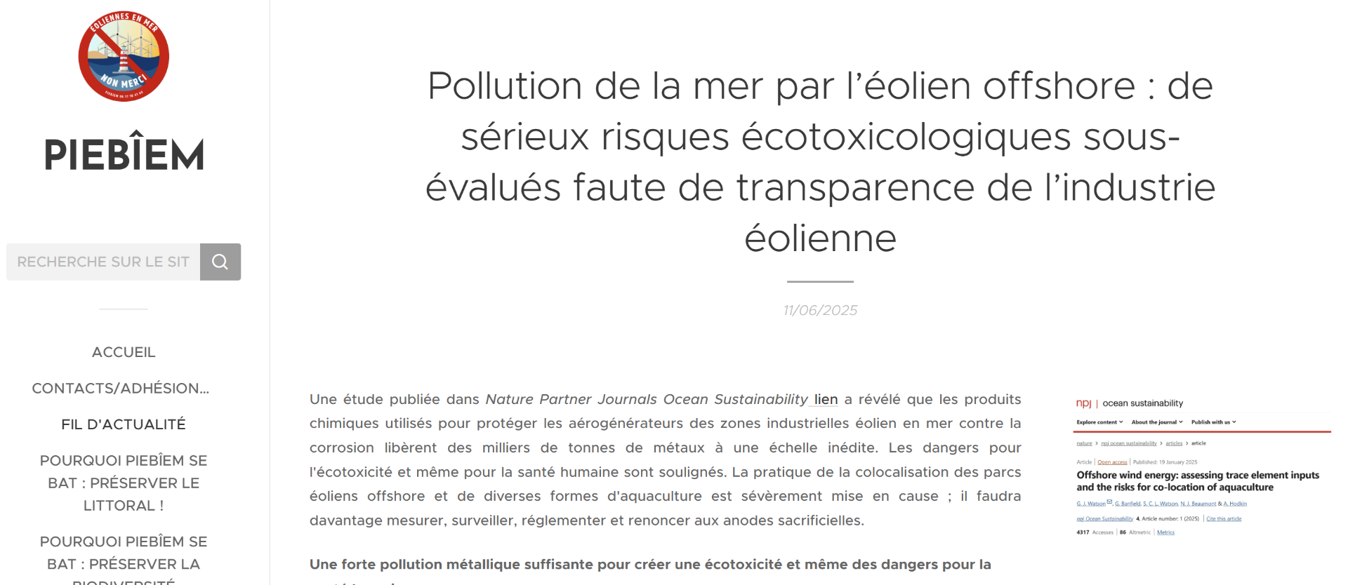 PIEBÎEM : Une étude publiée dans Nature Partner Journals Ocean Sustainability a révélé que les produits chimiques utilisés pour protéger les éoliennes en mer contre la corrosion libèrent « des milliers de tonnes de métaux tels que l'aluminium, le zinc et l'indium » chaque année, suffisamment pour atteindre des niveaux toxiques induisant des concentrations tissulaires élevées dans les huîtres, les moules et le varech… qui pourraient « largement dépasser » « l'apport hebdomadaire tolérable » pour un adulte. Lien