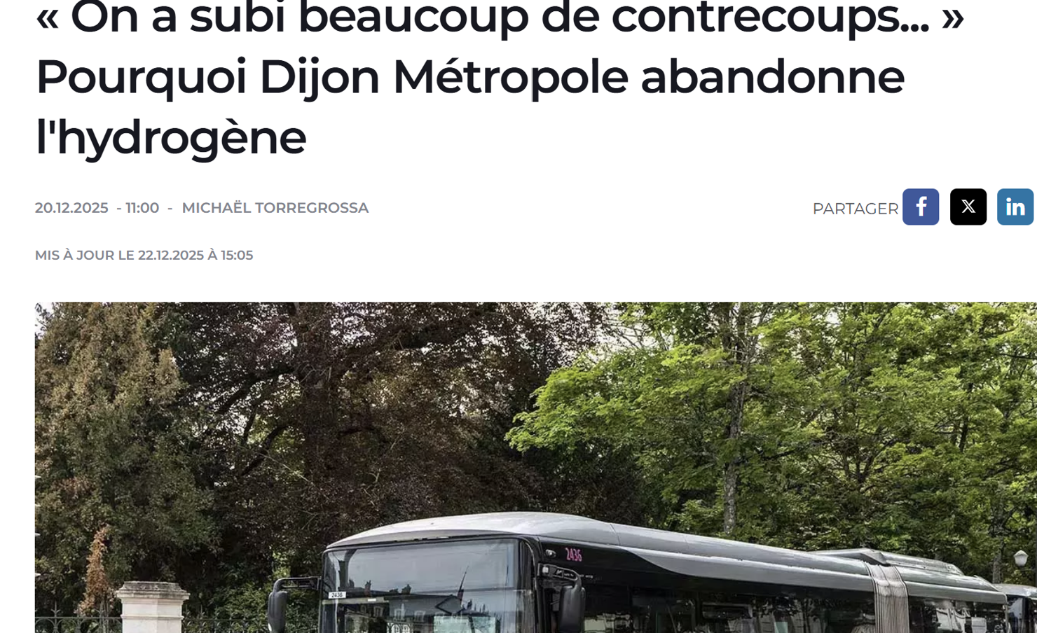 Dijon : Deux jours avant l'annonce de Loher, Dijon annonçait renoncer aux bus à hydrogène. La métropole de Dijon abandonne l'hydrogène pour ses bus. L'échec industriel de ses partenaires pousse la collectivité vers l'électrique et les biocarburants. Cette décision a été annoncée par le président de la collectivité, François Rebsamen, lors du conseil métropolitain de ce jeudi 18 décembre. L'élu évoque un « abandon » de la solution hydrogène, faute d'un « équilibre économique » satisfaisant. « On a subi beaucoup de contrecoups » admet François Rebsamen pour qui ce changement de stratégie s'explique principalement par les défaillances de deux acteurs clés du projet. Constructeur des 27 premiers bus à hydrogène commandés, Van Hool a été placé en faillite en avril 2024. Même sort pour McPhy Energy, fournisseur de l'électrolyseur destiné à alimenter la station hydrogène locale, dont la liquidation est intervenue en 2025. Lien