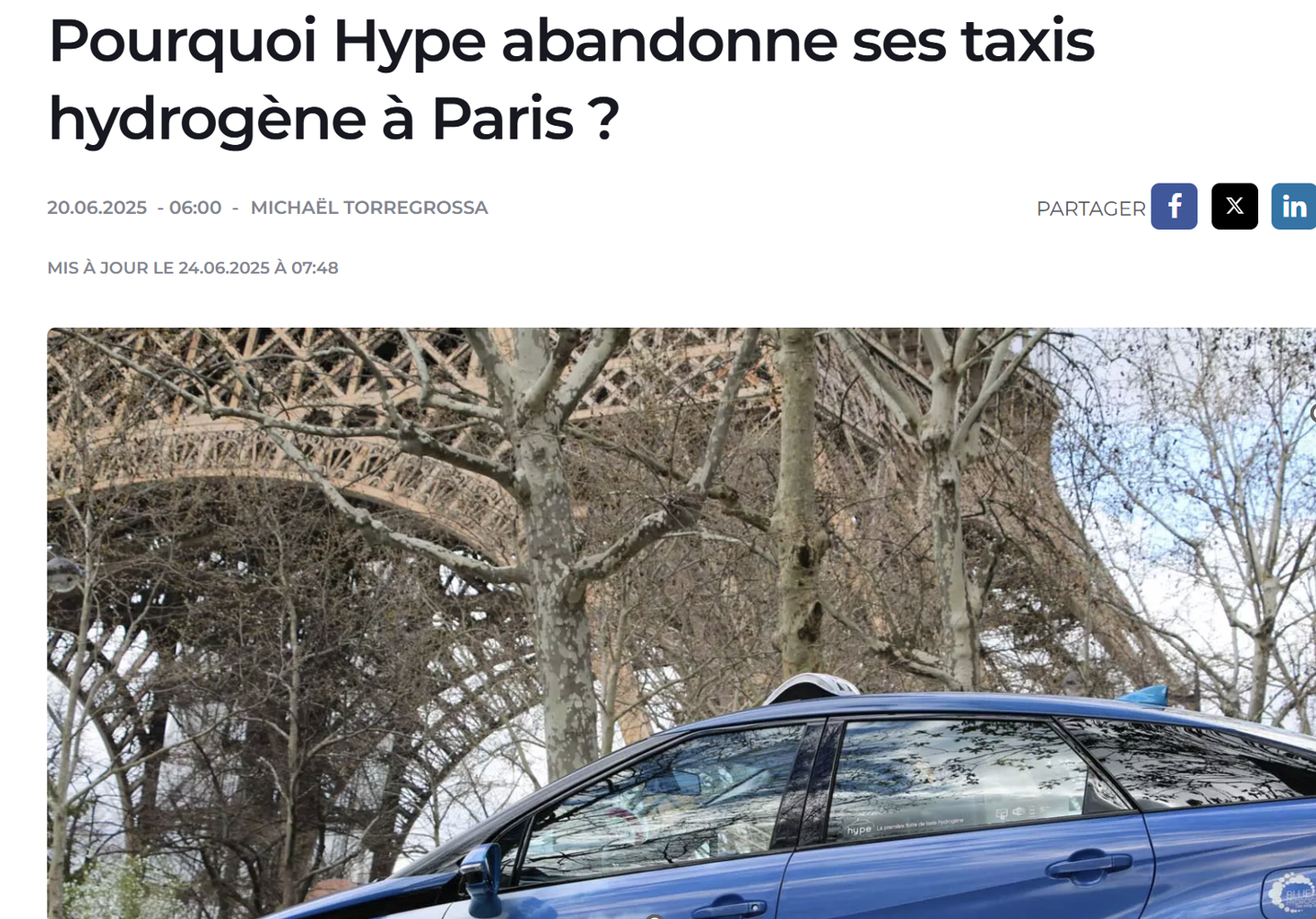 Paris : Cette année aussi, en juin 2025, les taxis à hydrogène Hype à Paris ont annoncé abandonner l'hydrogène pour passer à l'électrique. Cause économique : En 2025, après tous les discours, les plans nationaux, les subventions européennes, nationales et régionales massives, les JOP de Paris 2024, la dizaine de stations déployées en Ile-de-France, avec une capacité de distribution multipliée par 200, le plus gros client et de loin que nous sommes, paie en Ile-de-France son hydrogène (non vert) entre 16 et 18 € HT/ kg, soit 19,2 € et 21,6 € TTC/ kg, prix affichés à la pompe. C'est 5 fois plus cher que le coût équivalent pour le même kilométrage d'une recharge rapide avec de l'électricité verte fournie par Electra (0,29 € TTC / kwh)… Concrètement, pour produire à court terme de l'hydrogène vert, il faut des électrolyseurs, et le seul fabricant français était McPhy : or ce qui est train de se passer avec McPhy (NB qui a fait faillite) dissuade de maintenir sa confiance dans la filière hydrogène française. Lien