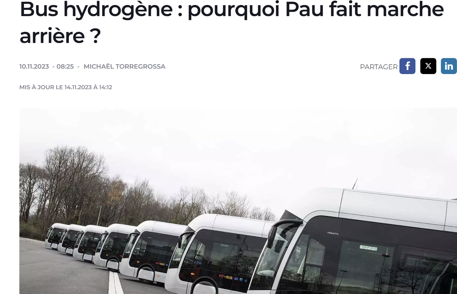 Pau : En 2023, Pau qui avait été pionnière dans l'acquisition de bus à hydrogène a abandonné cette stratégie : Pionnière du bus à pile combustible avec son réseau Fébus, l'agglomération de Pau a finalement choisi de s'orienter vers l'électrique. L'agglo s'est orientée vers l'acquisition de 8 bus électriques par an sur les dix prochaines années. Un changement stratégique lié aux coûts de la technologie mais aussi aux progrès des bus à batteries. « L'hydrogène serait trop lourd à gérer » reconnait le responsable de l'agglo. « La station de production a plus de problèmes que prévu et les bus ont plein de toutes petites pannes. Quant à moi, j'y passe les trois quarts de mes journées alors que ce n'est que l'une des 17 lignes ! » lien
