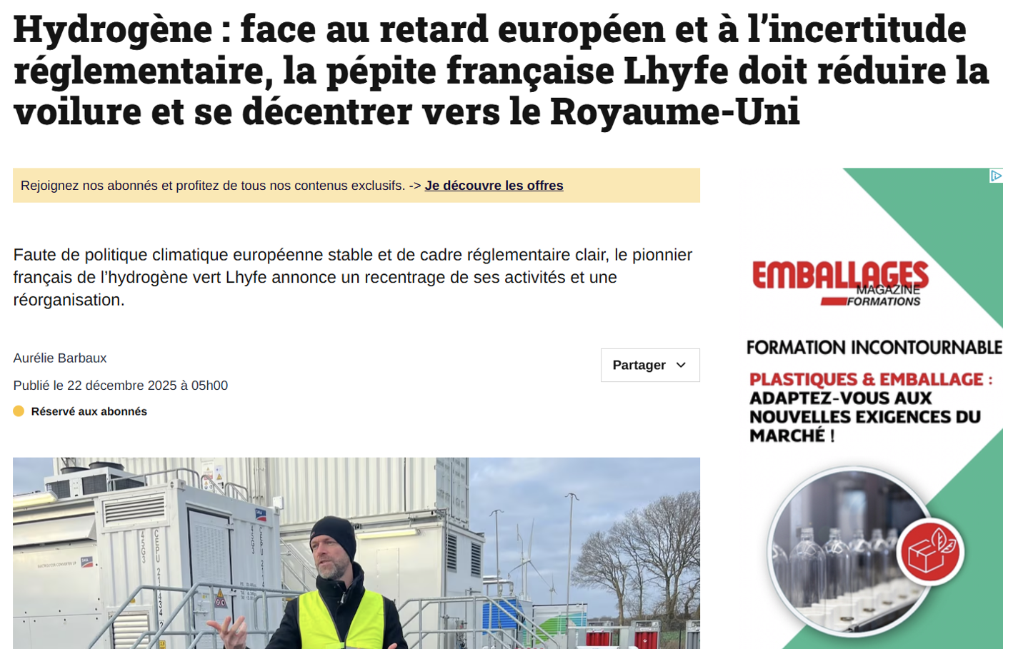 Enfin, le 22 décembre 2025, soit le jour même de l'annonce de Fabrice Loher, Lhyfe annonçait un recentrage de ses activités et une réorganisation, qui l'oriente davantage vers l'Angleterre et Total. Matthieu Guesné, son fondateur et président-directeur général, annonçait à son grand regret un changement majeur de stratégie. Son modèle historique consistait, pour décarbonner la mobilité, à remplir d'hydrogène les réservoirs des véhicules, mais il est bien forcé de constater les difficultés intrinsèques de la mobilité hydrogène. Il s'oriente désormais, dans un partenariat avec Total, à fournir de l'hydrogène vert ( jusqu'à 500000 tonnes par an) pour réduire les émissions de ses raffineries. Lien