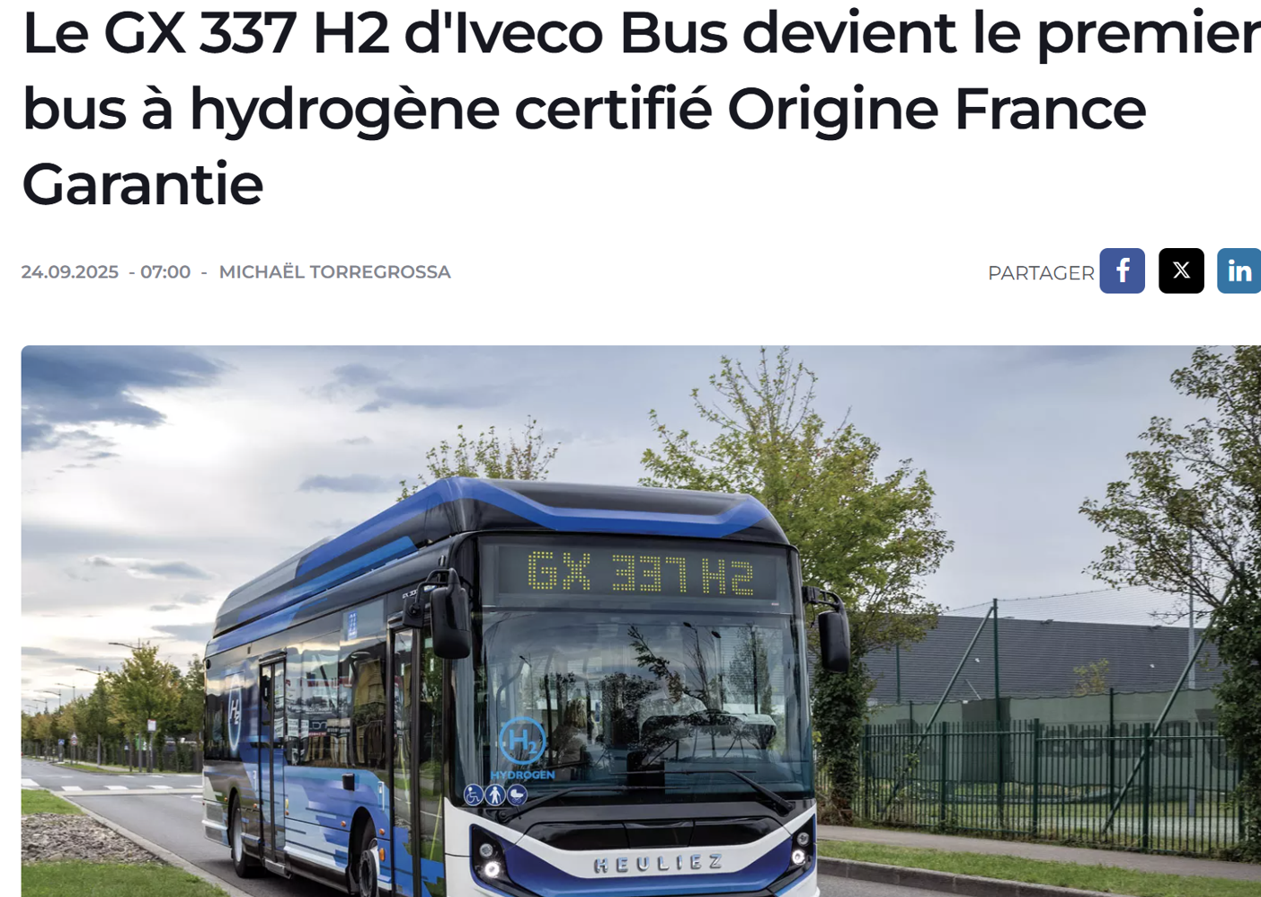 Ce n'est que dans le deuxième semestre 2025 qu'Iveco a proposé son GX 337 H2 d'Iveco qui est le premier bus à hydrogène certifié Origine France Garantie. La reconnaissance concerne à la fois la conception, assurée dans le centre R&D de Vénissieux, et la fabrication, réalisée dans l'usine d'Annonay, en région Auvergne-Rhône-Alpes. Le problème, c'est qu'il est doté d'une pile à combustible de 100 kW issue de la filiale HTWO de Hyundai qui constitue quand même le point critique de la chaine de valeur. lien