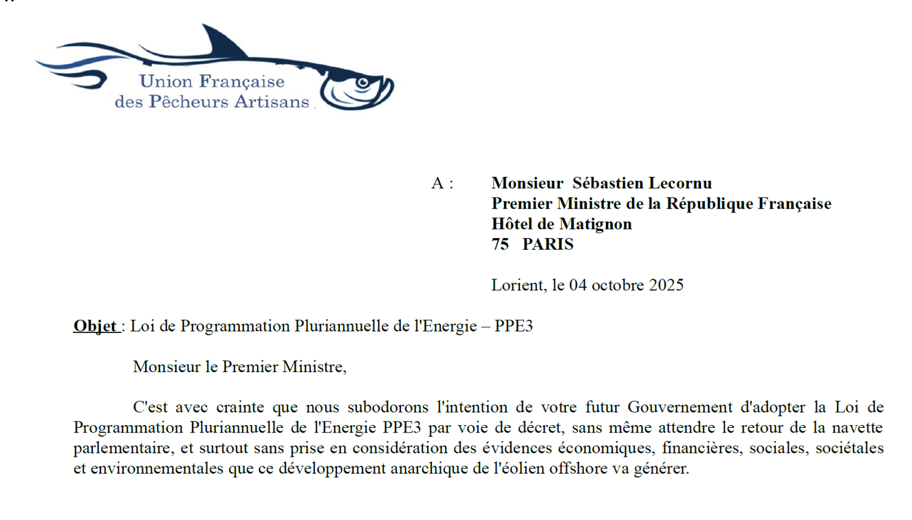 1) La lettre de l'UFPA au Premier ministre M. Lecornu : Eviter les conséquences économiques, financières, sociales, environnementales de l'éolien en mer (texte complet en PJ)