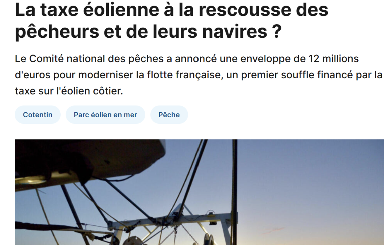 La Presse de la Manche au moins a été plus dubitative en titrant : « La taxe éolienne à la rescousse des pêcheurs et de leurs navires ? » et rappelé que « en 2023, Emmanuel Macron avait annoncé que 700 millions d'euros seraient investis d'ici à 2035 pour accompagner la pêche française, grâce aux recettes dégagées par les champs éoliens... Pour rappel, 35 % de cette taxe sur l'éolien côtier revient aux professionnels de la pêche (comité national et régional) ». NB : Non justement, pas aux professionnels de la pêche, mais aux comités censés les représenter !