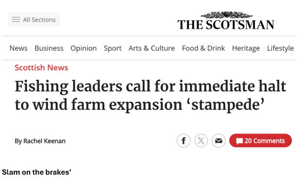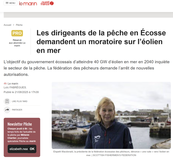 Il y a un peu plus de dix ans, l'Ecosse s'est voulue comme l'Arabie Saoudite des énergies renouvelables. Les Pêcheurs écossais, avec des zones éoliennes plus éloignées des côtes qu'en France et qui ont su pourtant s'adapter à l'industrie gazière, tirent la sonnette d'alarme : le plan de développement de l'éolien en mer (40GW) provoquera leur disparition. Ils dénoncent un pari imprudent avec l'emploi, le patrimoine et l'environnement, l'éviction des zones de pêche traditionnelles, le manque de concertation, de mesures de protection… : « L'approche du gouvernement écossais consiste à choisir les gagnants et les perdants, et la pêche semble perdre à chaque fois ». Cet avertissement doit servir à la France, où faute d'un moratoire sur l'éolien en mer, le plan éolien de 45 GW aura les mêmes effets. Un moratoire s'impose