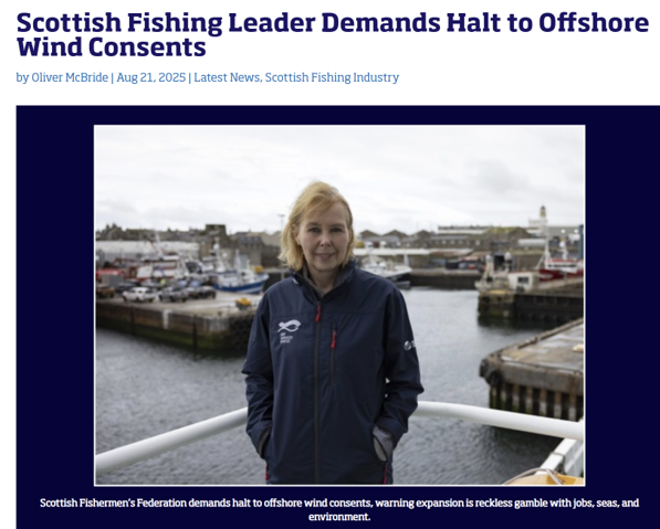 « Les dirigeants écossais de la pêche appellent à l'arrêt immédiat de l'autorisation de nouveaux parcs éoliens offshore, avertissant que les ministres prennent un « pari imprudent » avec l'emploi, le patrimoine et l'environnement. La Fédération Ecossaise des Pêcheurs (SFF) affirme que les plans du gouvernement visant à installer jusqu'à 40 GW de capacité éolienne offshore d'ici 2040 sont « beaucoup trop élevés » et causeraient des dommages irréversibles aux écosystèmes marins tout en évinçant les flottes des zones de pêche qui ont été exploitées pendant des générations. La demande d'un moratoire s'inscrit dans les réponses officielles du SFF à deux consultations majeures : la mise à jour de la déclaration de politique sur l'éolien offshore et le projet de plan marin sectoriel pour l'énergie éolienne offshore. L'organisme industriel met en garde contre des « impacts négatifs importants et à long terme » sur le secteur de la pêche si les plans se poursuivent."