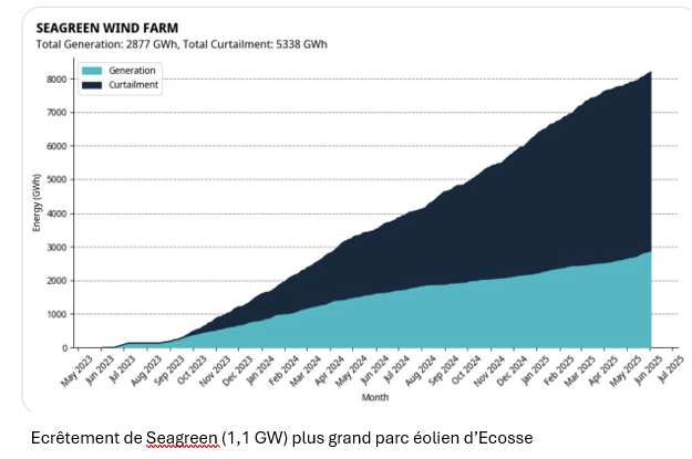 D'autant que, aux conséquences dénoncées et redoutées par les pêcheurs s'ajoute la plus grande absurdité économique : presque deux fois plus d'écrêtement que de production pour le plus important parc éolien en mer d'Ecosse, Seagreen ( autrement dit bien que payée, les deux tiers de la production sont annulés)
