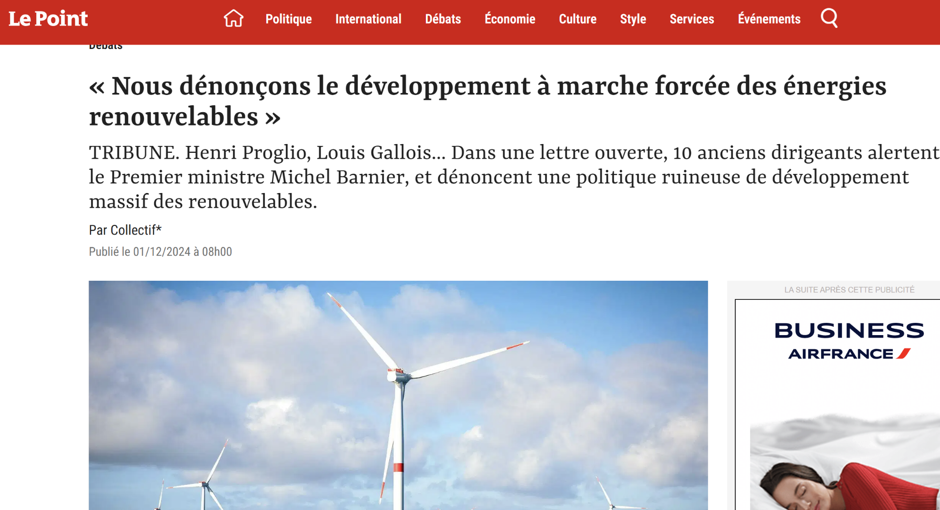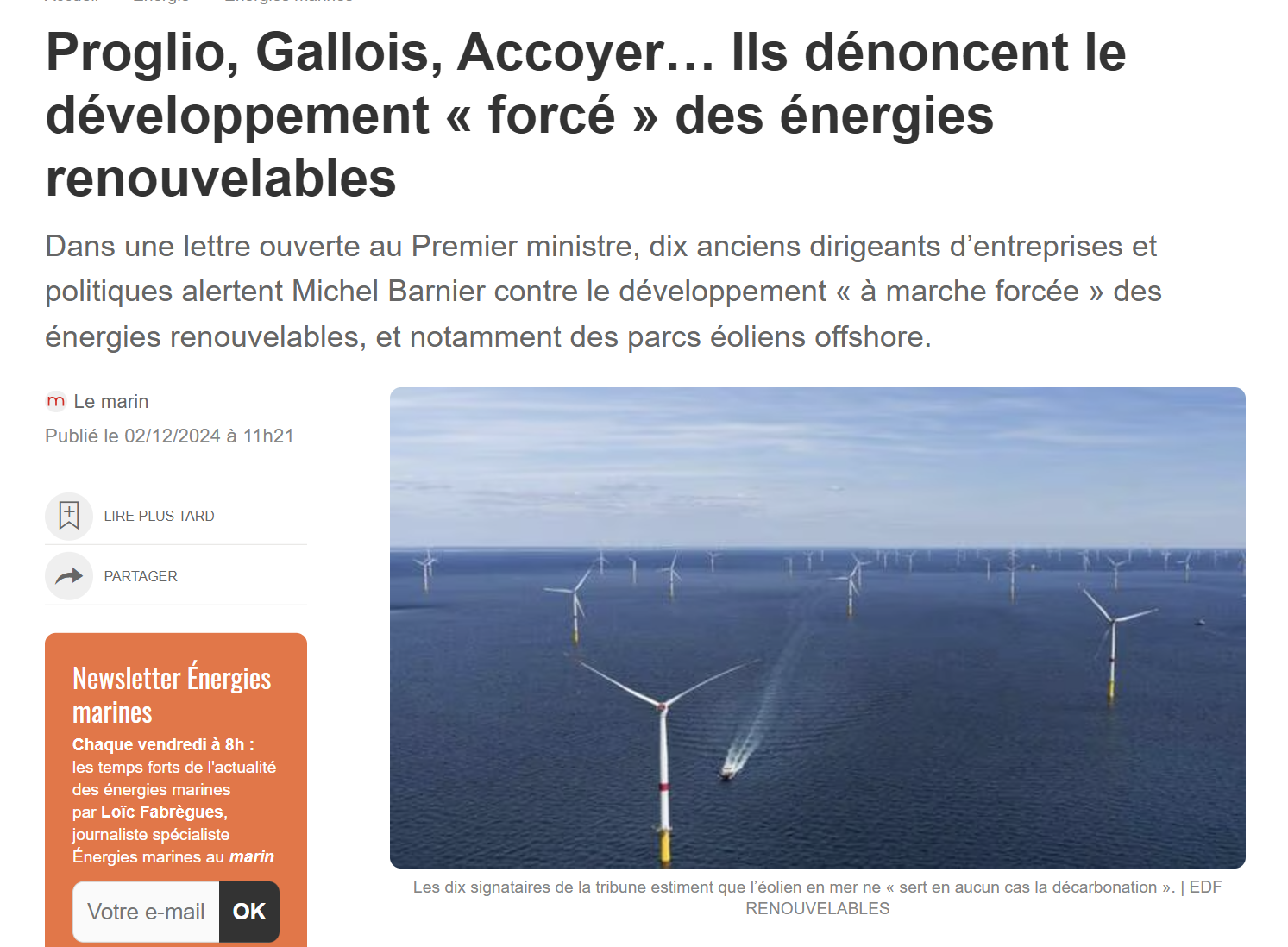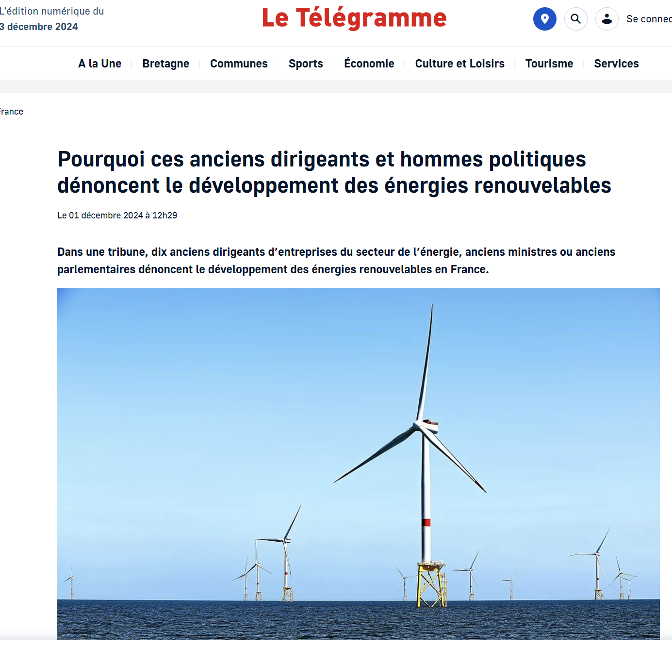 Pour la première fois, des anciens dirigeants d'entreprises publiques comme Louis Gallois ou Henri Proglio, d'anciens ministres comme le Morbihannais François Goulard ou parlementaires comme Bernard Accoyer, unissent leurs voix pour peser dans le débat énergétique et dénoncent notamment le développement « à marche forcée » des énergies renouvelables, et notamment des parcs éoliens offshore. Une initiative que la Presse locale et nationale a largement relayée et qui devrait enfin encourager à un vrai débat. Merci à eux !