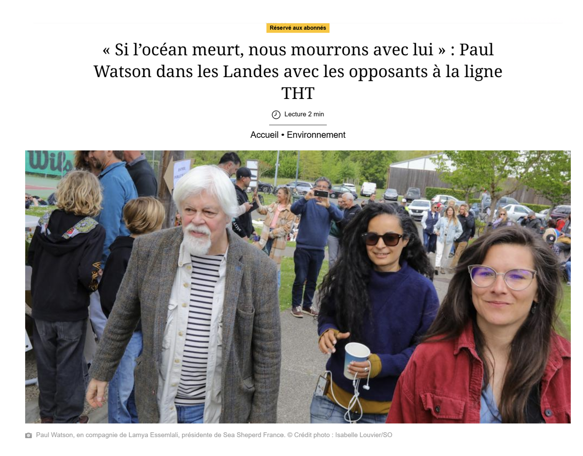 Fin avril, le capitaine Paul Watson, à peine rentré de sa détention groenlandaise, apportait son soutien aux opposants de la connexion Golfe de Gascogne THT Très Haute Tension sous-marine entre la France et l'Espagne. Il s'agit d'un projet de ligne de 400.000 volts reliant sur 400 km le réseau électrique des deux pays, et dont la majeure partie sera sous-marine entre Cubnezais, à proximité de Bordeaux, et Galika à proximité de Bilbao. Le 27 avril 2025, le fondateur du mouvement Sea Shepherd et de nombreux experts ont débattu sur les conséquences marines et terrestres de l'actuel tracé du projet d'interconnexion électrique porté par RTE dans le golfe de Gascogne. Marie Darzacq, présidente du collectif StopTHT 40 souligne que dans l'état actuel des choses, il s'agirait « de la ligne la plus puissante de France », avec 400 000 volts en courant continu et déplore le fait que « l'alternative terrestre du tracé, le long de l'autoroute » n'ait pas été prise davantage en considération. « La justice sera le seul rempart qui pourra freiner les abus de pouvoir de l'État, pour imposer l'application et le respect de la loi. » Malheureusement, les recours déposés auprès du Tribunal administratif de Bordeaux. Ces derniers ont été rejetés et les travaux continuent. Lien