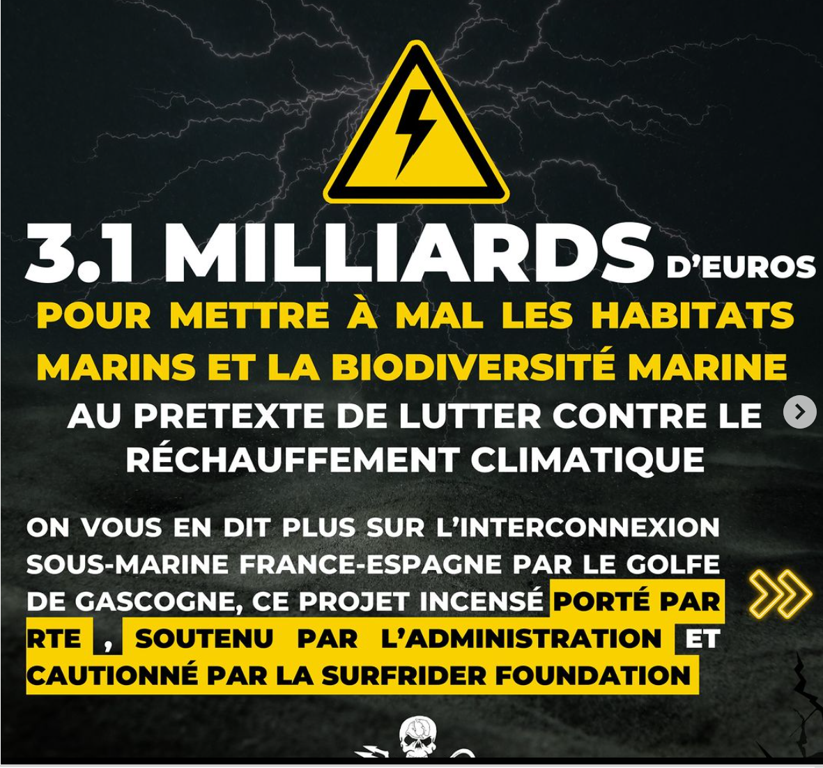 Et Sea Shepherd en profite pour fustiger l'inaction ( et même la complicité) d'ONG soi-disant environnementalistes puissantes et bien subventionnées tel Surfrider : « Il y a quelques semaines, nous avions également demandé des explications à Surfrider France qui soutient le projet de RTE en l'état. Un positionnement incompréhensible à nos yeux. Il est très préoccupant que des ONGs qui prétendent veiller aux intérêts de l'océan apportent une caution environnementale à des projets aussi destructeurs. Leur réponse qui nous a été faite, n'est finalement qu'un copié collé des éléments de langage disponibles sur le site et ne nous a guère convaincus »