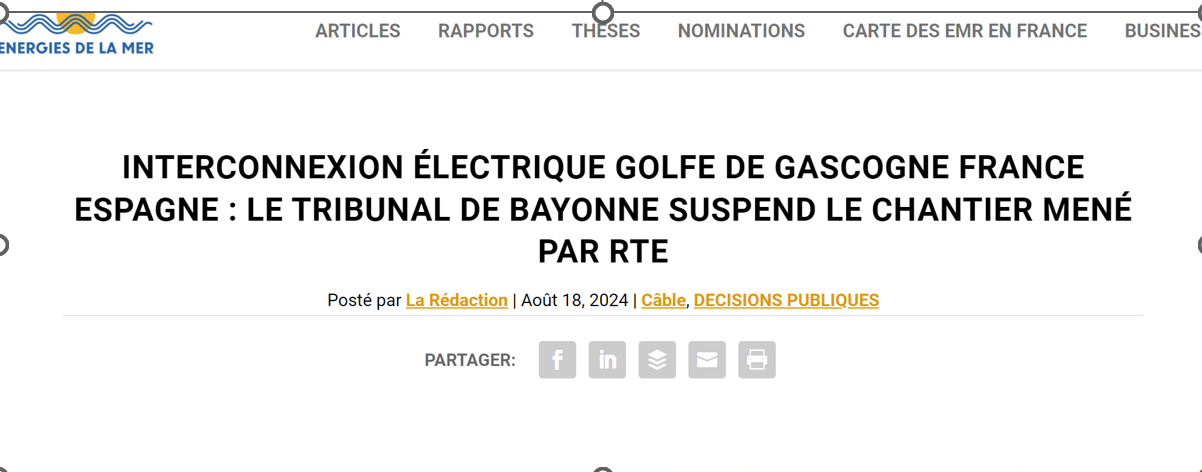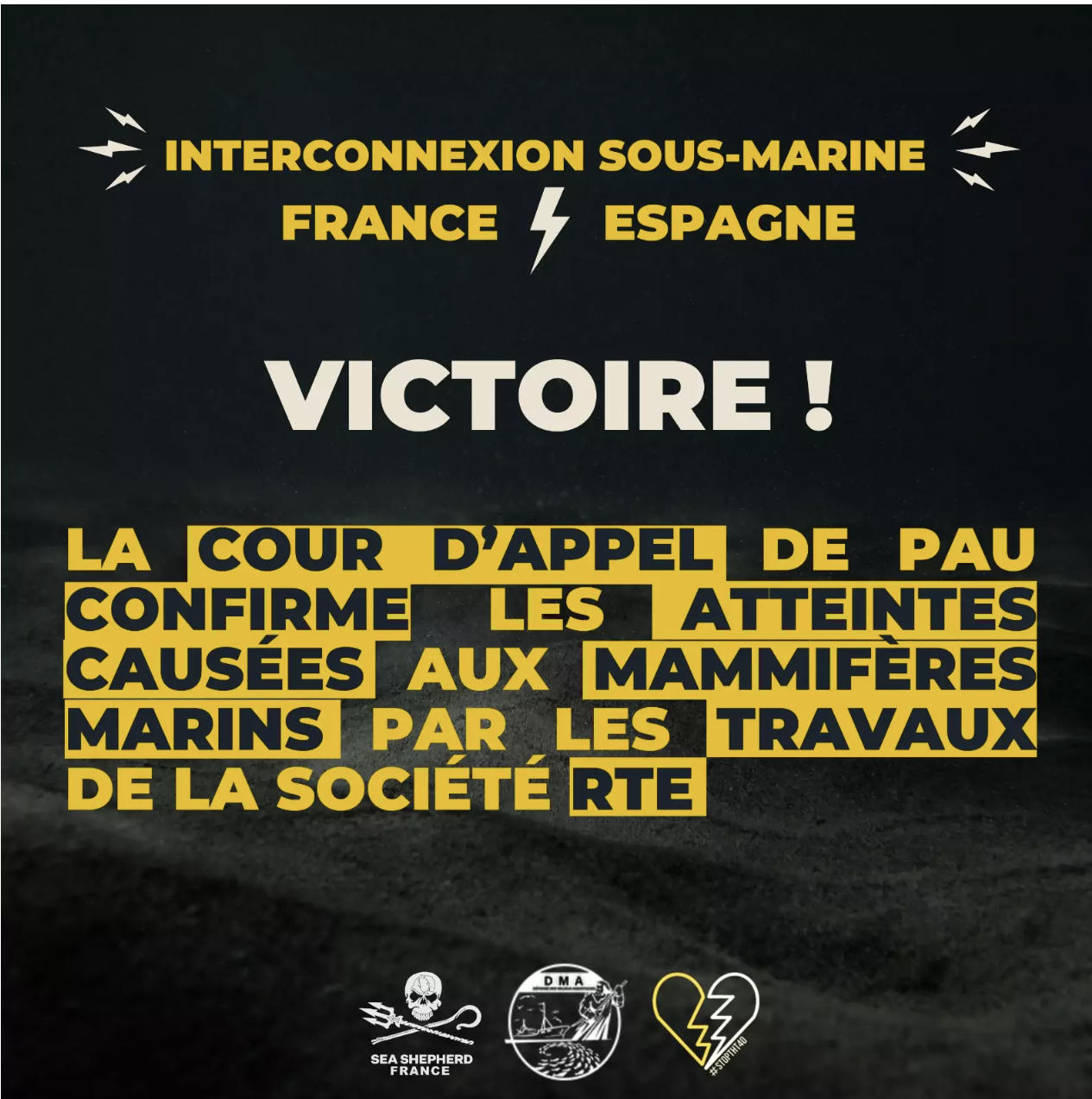Le tribunal de Bayonne, le 14 aôut 2023 avait suspendu provisoirement les travaux menés par RTE pour sa a suspendu les travaux menés par RTE pour sa ligne Très Haute Tension sous-marine entre la France et l'Espagne en raison des nuisances sonores pour les mammifères marins. Etat ou pas, RTE doit respecter la loi ! Ce qui ne parait d'ailleurs pas très difficile puisqu'il a pu reprendre les travaux au bout de cinq jours. Association requérante, Sea Shepherd réitère sa position : « On ne peut pas sacrifier la biodiversité pour lutter contre le changement climatique » et fustige les positions contraires d'organisations soi-disant écologiques comme Surfrider.