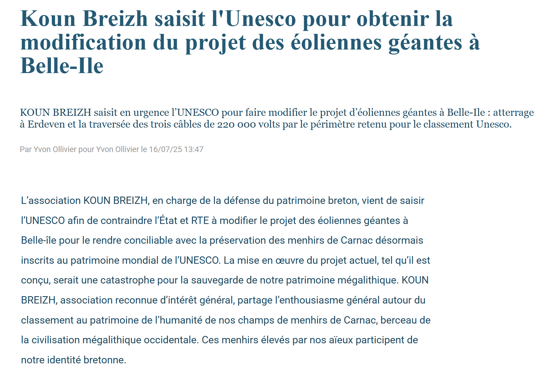 Extrait de leur CP : « L'association KOUN BREIZH, en charge de la défense du patrimoine breton, vient de saisir l'UNESCO afin de contraindre l'État et RTE à modifier le projet des éoliennes géantes à Belle-île pour le rendre conciliable avec la préservation des menhirs de Carnac désormais inscrits au patrimoine mondial de l'UNESCO. La mise en œuvre du projet actuel, tel qu'il est conçu, serait une catastrophe pour la sauvegarde de notre patrimoine mégalithique…