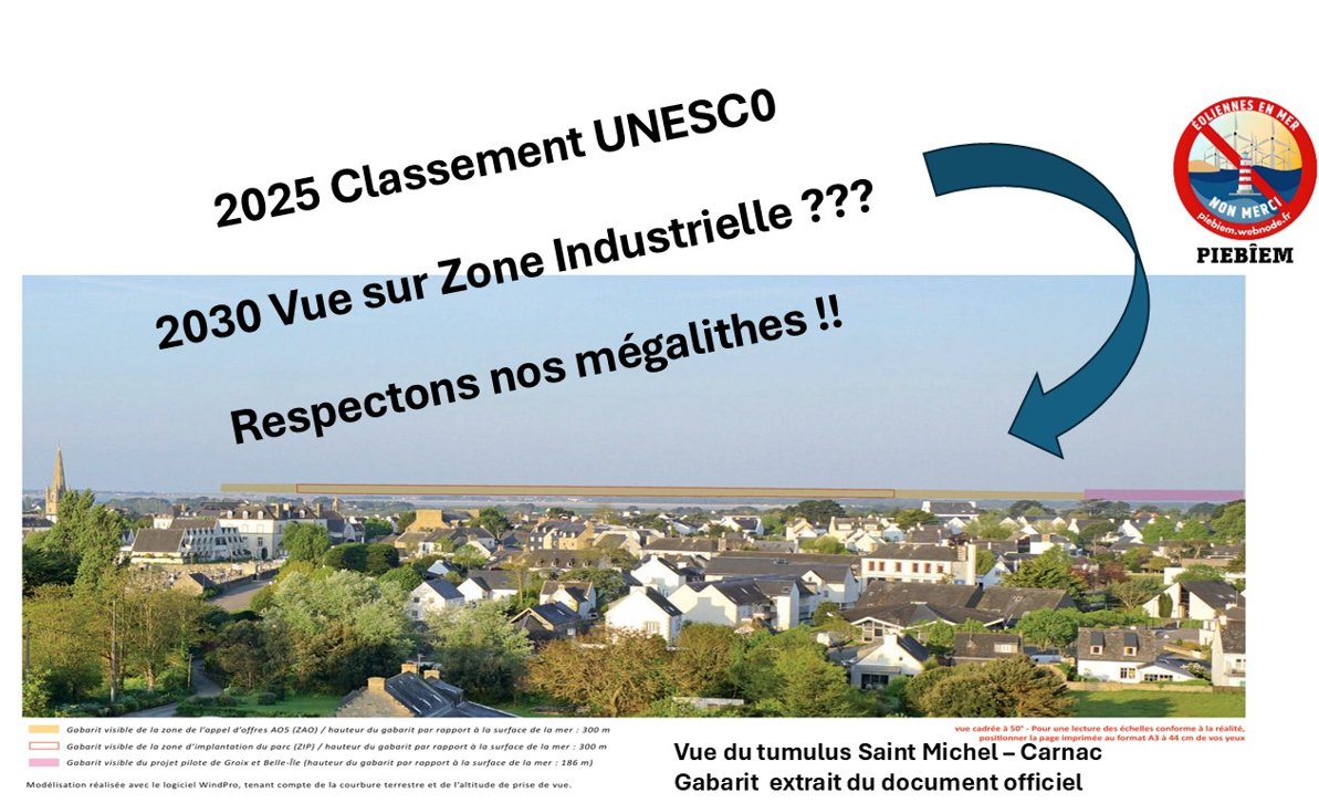 Comment accepter en effet qu'un « parc éolien » ( Bretagne sud) puisse être implanté à proximité de ce site appartenant désormais au Patrimoine Mondial ? Ce parc se situerait à 19 km de Belle-Île, 29 km de l'île de Groix et 33 km de Quiberon. Une quarantaine d'éoliennes flottantes, de 300 mètres de hauteur chacune, seraient ainsi implantées sur une surface totale de 100 à 150 km². Rappelons que le classement UNESCO englobe 550 monuments mégalithiques répartis sur un territoire de plus de 1000 km² qui s'étend de la Baie de Quiberon au Golfe du Morbihan.