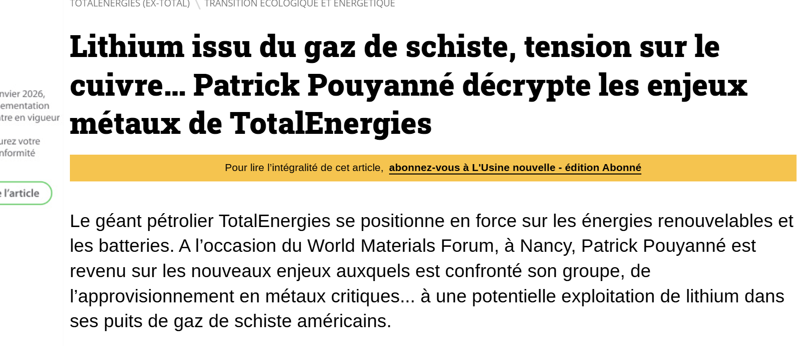 L ' enjeu des métaux pour les renouvelables est bien identifié . « C' est un nouveau monde . La fabrication d ' une plateforme de gaz requiert à peu près 1 000 kilogrammes de matériaux pour un mégawatt (MW) d ' énergie . Pour le solaire , c' est de l ' ordre de 6 000 kg par MW , 10 000 pour l ' éolien terrestre , et 15 000 pour l ' éolien en mer» , chiffre Patrick Pouyanné . S' appuyant notamment sur le rapport Varin , remis en janvier 2022 pour décrypter l ' approvisionnement en métaux de l ' industrie française , il souligne les risques de «goulot d ' étranglement» que pose la transition énergétique , et la «renaissance de l ' industrie minière» qu' elle suscite. Bien sûr les métaux de batteries sont critiques , reconnaît-il . Mais «le métal le plus critique n' est pas celui auquel vous pensez : c' est le cuivre . Nous avons d ' énormes besoins et commençons à affronter des pénuries» , déclare l ' industriel . Le PDG insiste : il faut mobiliser des kilomètres de ligne de transmission gros diamètre pour connecter un parc éolien offshore . De même , les aimants permanents dans les générateurs des éoliennes offshore mobilisent « 600 kg de terres rares pour chaque MW» . Usine nouvelle, lien