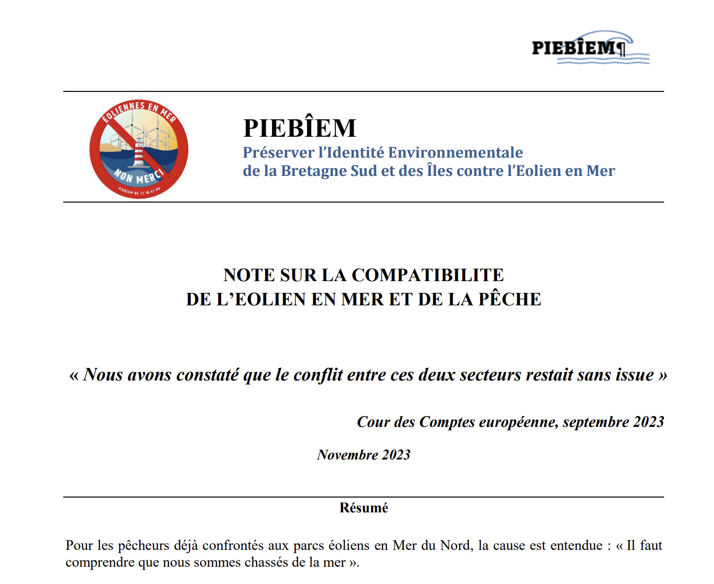 PIEBÎEM rappelle enfin cette conclusion de la Cour des Comptes Européenne dans son rapport de 2023 sur les énergies marines renouvelables : "Le déploiement des énergies marines renouvelables se heurte à des obstacles pratiques, sociaux et environnementaux qui n'ont pas encore fait l'objet d'une réflexion suffisante… le conflit entre ces deux secteurs ( la pêche et l'éolien en mer reste sans issue " en PJ notre note pour La Mer en Débat