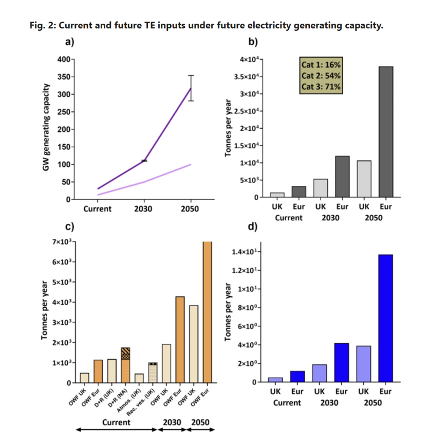 Dans le cadre des plans d'expansion actuels des gouvernements, ces pollutions pourraient être multipliés par 12 d'ici 2050 (cf graphe) , ce qui soulève de sérieuses inquiétudes quant à l'accumulation potentielle de métaux dans les espèces marines comme les huîtres, les moules et les algues, qui sont également susceptibles d'être cultivées à proximité des parcs éoliens.
