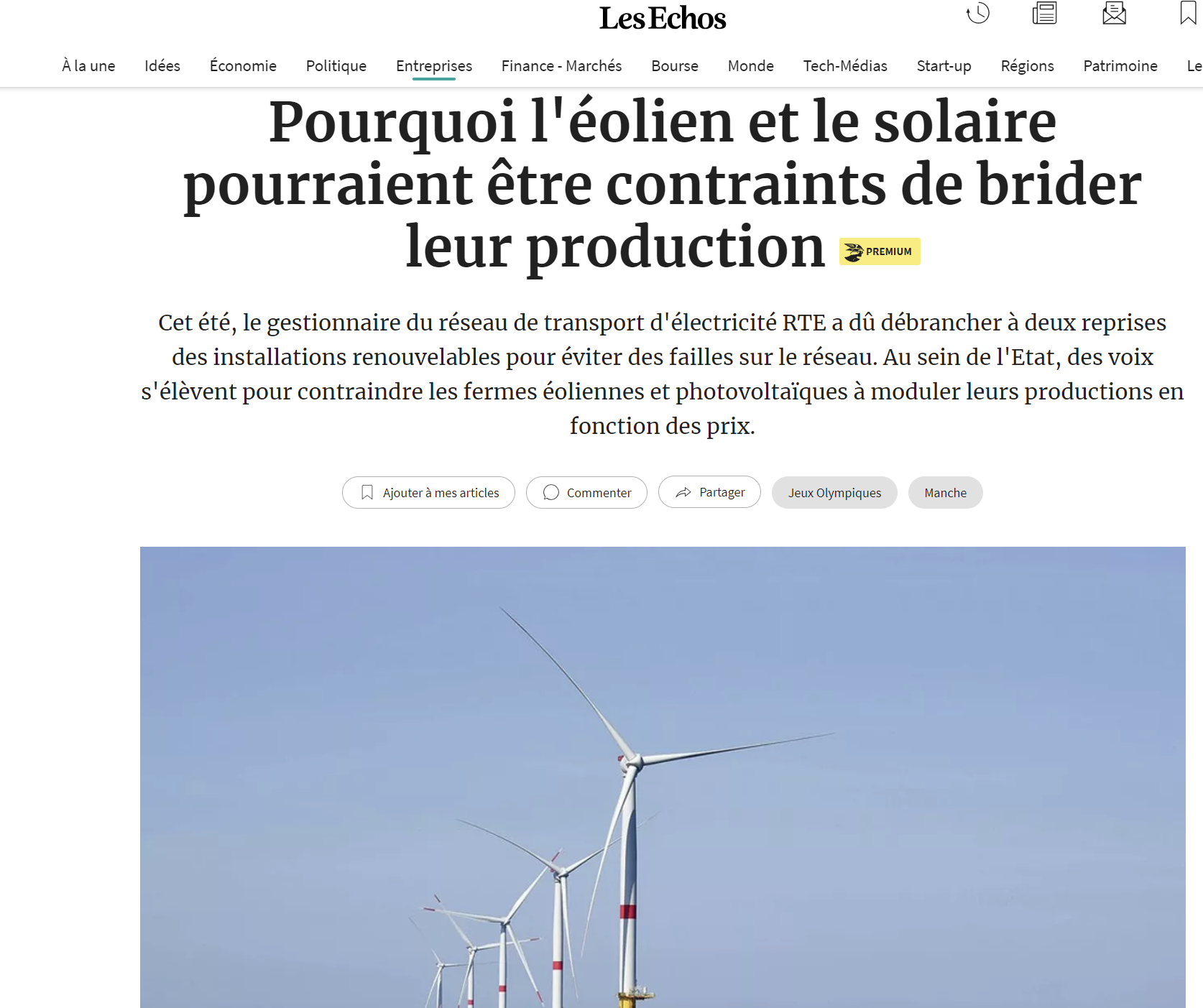 « L'épisode est passé quasiment inaperçu mais il atteste des perturbations croissantes sur le réseau électrique français. Alors qu'à Paris les préparatifs pour les Jeux Olympiques battaient leur plein, dans la Manche, le 16 juillet dernier, les parcs éoliens installés au large de Saint-Nazaire, de Fécamp et de Saint-Brieuc mais aussi la ferme photovoltaïque de Cestas , l'une des plus puissante en France située dans le Sud-Ouest, ont reçu l'ordre de cesser immédiatement d'envoyer de l'électricité sur le réseau. »