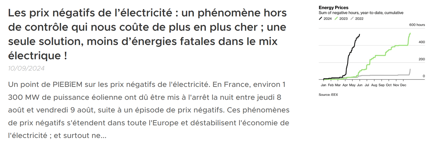 Remarquable article de Sharon Wajsbrot dans Les Echos, qui confirme nos analyses regroupées dans les fils d'actu de la semaine dernière lien lien lien. Avec l'accroissement des Energies Fatales Intermittentes dans le mix électrique, la stabilité du réseau est mise en péril et les coûts explosent. Celles-ci devront participer à la solution des problèmes qu'elles causent, avec notamment la fin de l'obligation d'achat et des arrêts de productions imposés en cas de surproduction : un sujet explosif pour les producteurs renouvelables !