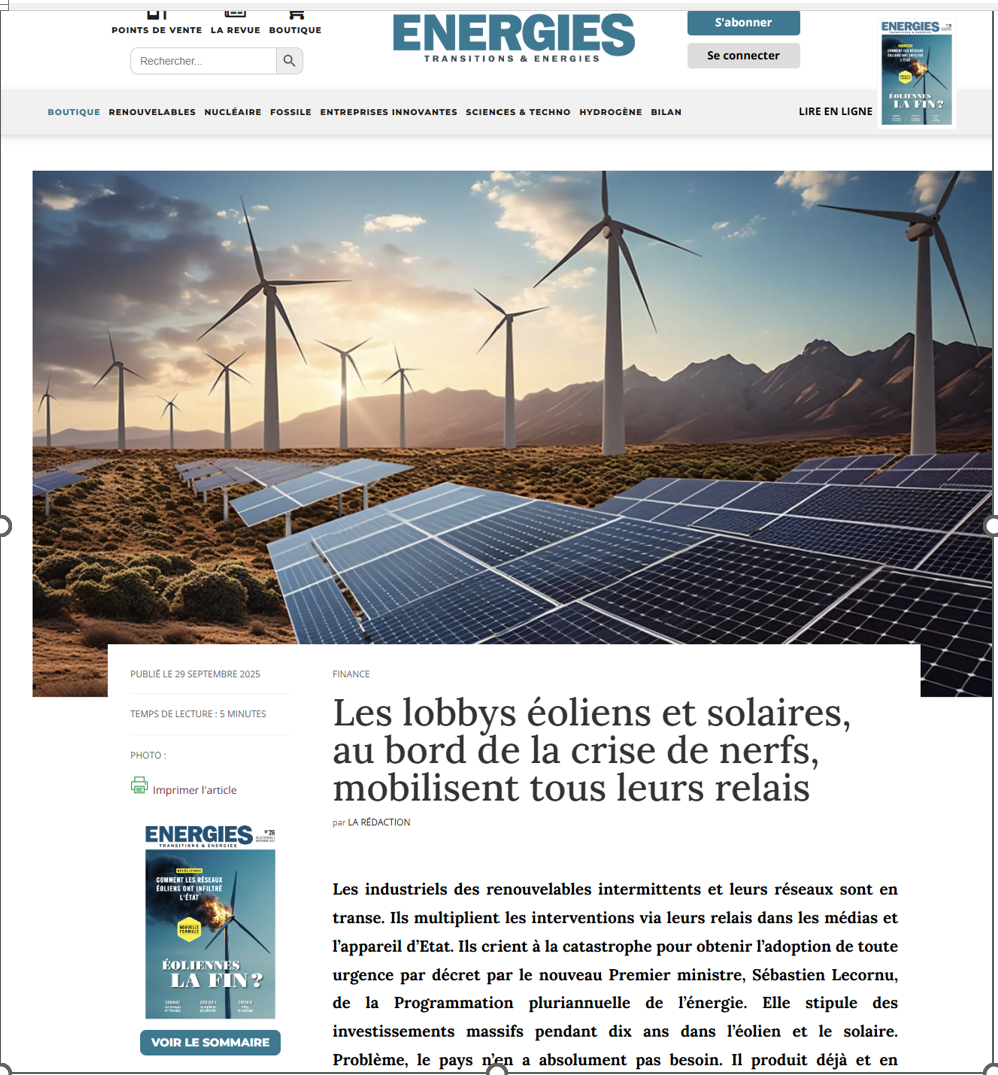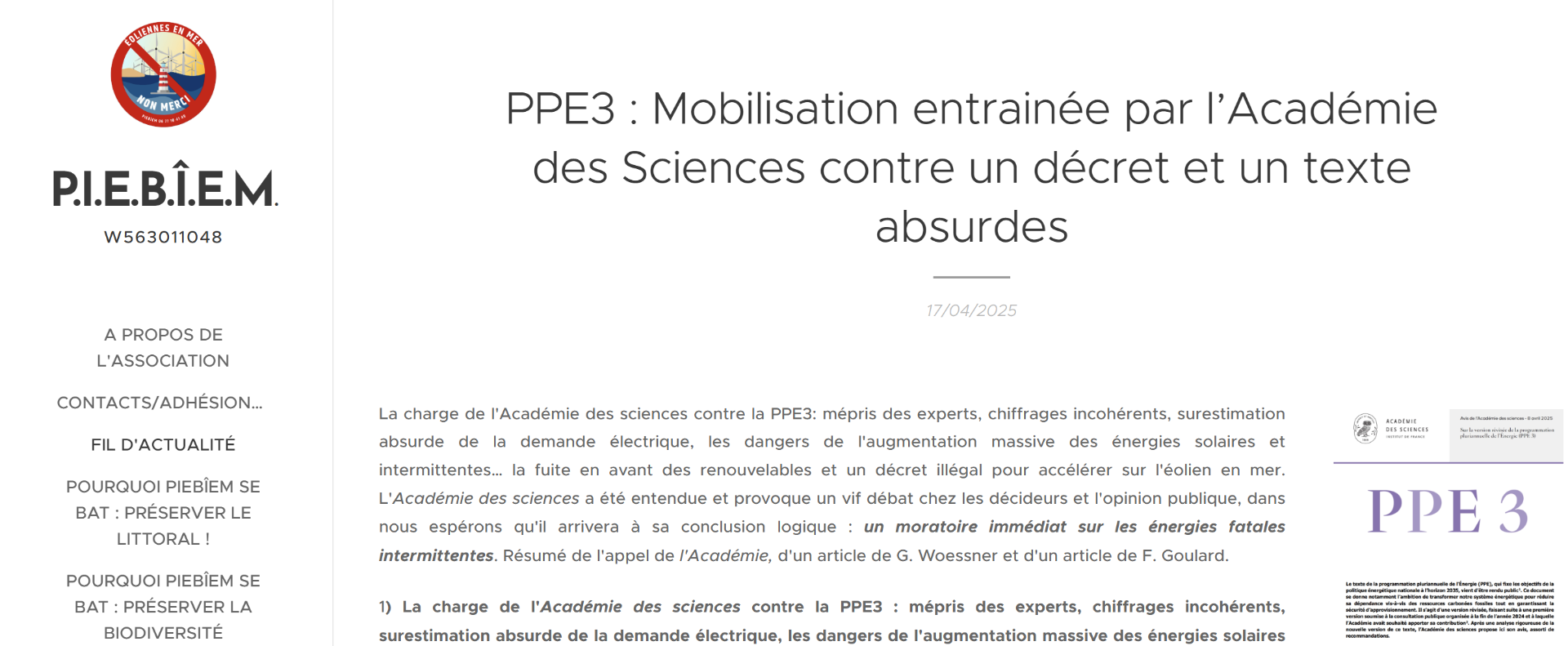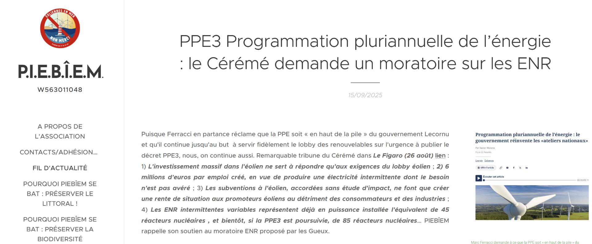 Un article de Contexte sur un éventuel moratoire éolien/solaire met le feu au lobby ENR et au ministère sur la PPE3. PIEBÎEM fait le point et quelques rappels. 1) L'info de Contexte : publication de la PPE3 et moratoire sur l'éolien terrestre et le solaire ; 2) Réaction du lobby ENR : un moratoire qui serait un déni démocratique et énegétique pour complaire au RN ; 3) La réaction du Premier Ministre : reculade sur le moratoire, mais… aucune rente ne sera tolérée ; 4) Une production ENR inutile (Académie des Sciences), dont le but n'est pas la décarbonation mais la sortie du nucléaire (Meynier-Millefert ), l'éolien offshore, un truc de Shadock qu'il faut arrêter tout de suite ( Jancovici)