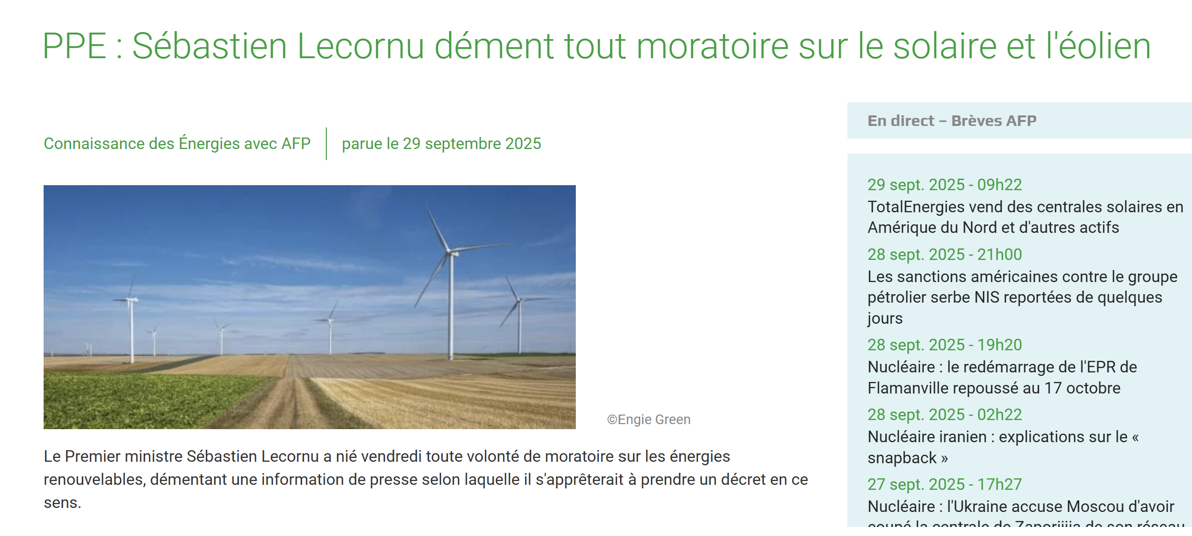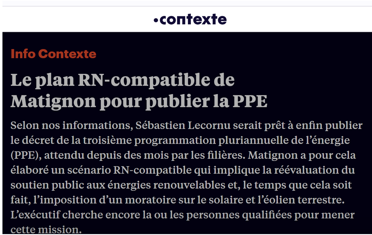 La revue spécialisée dans la politique énergétique Contexte a publié le 25 septembre une brève selon laquelle « Sébastien Lecornu serait prêt à enfin publier le décret de la troisième programmation pluriannuelle de l'énergie (PPE), attendu depuis des mois par les filières. Matignon a pour cela élaboré un scénario RN-compatible, impliquant de réévaluer les soutiens publics aux énergies renouvelables et, le temps que cela soit fait, d'imposer un moratoire sur le solaire et l'éolien terrestre. L'exécutif cherche encore la ou les personnes qualifiées pour mener cette mission. Lien
