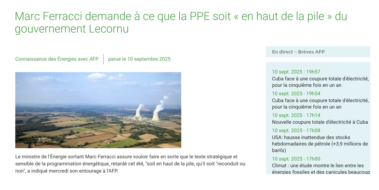NB Juste avant d'éventuellement partir, le ministre de l'énergie Ferracci continue à servir fidèlement le lobby ENR : « Le ministre de l'Énergie sortant Marc Ferracci assure vouloir faire en sorte que le texte stratégique et sensible de la programmation énergétique, retardé cet été, "soit en haut de la pile, qu'il soit "reconduit ou non", a indiqué mercredi son entourage à l'AFP.