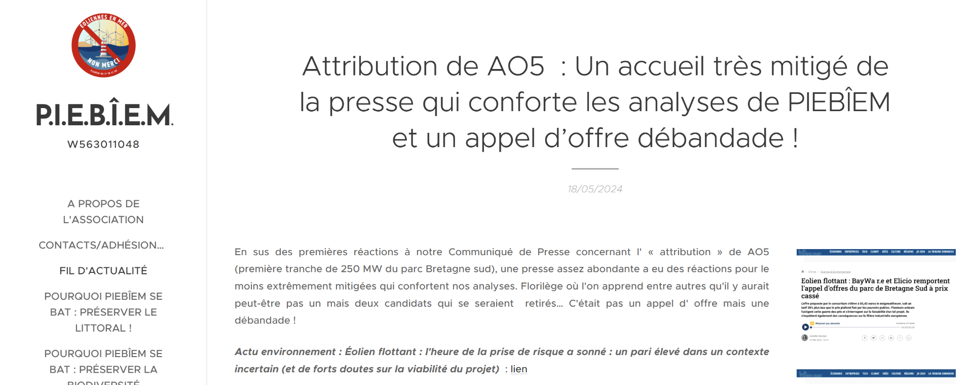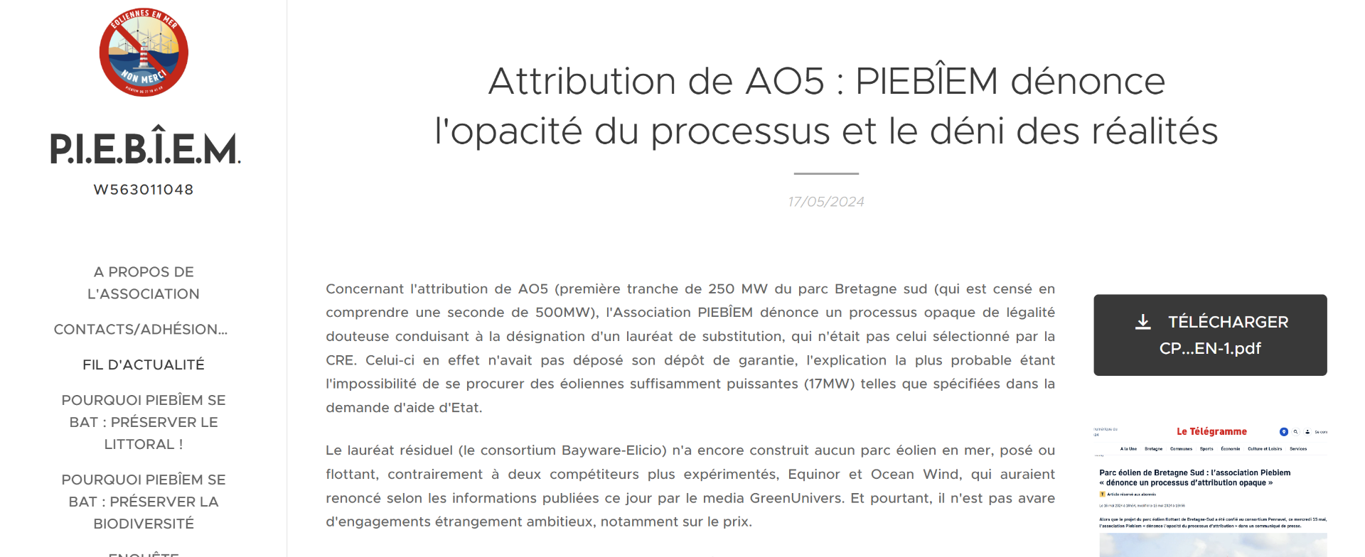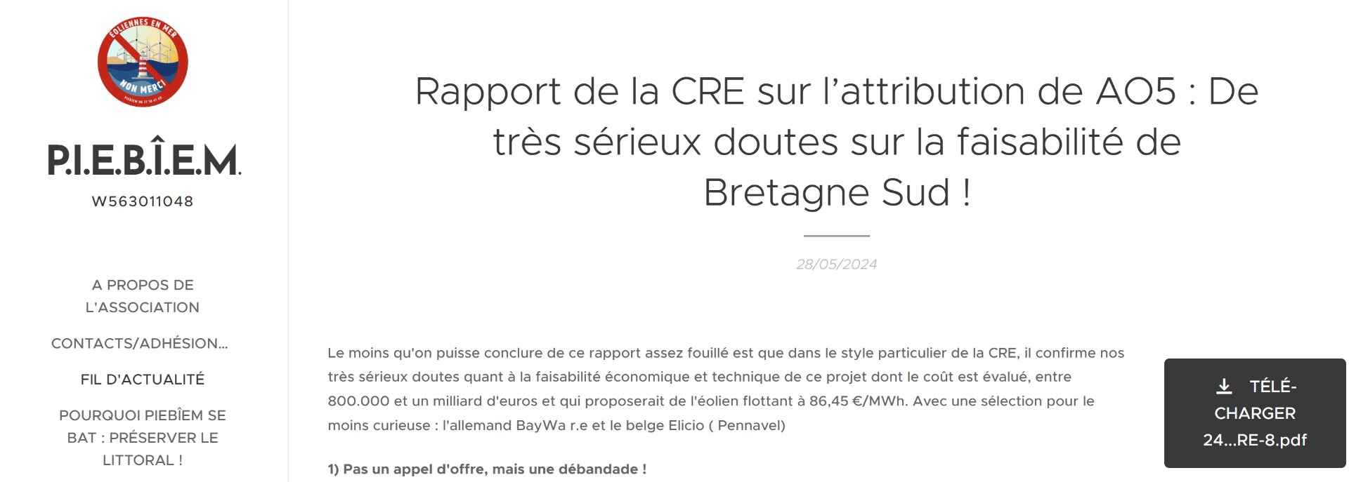 PIEBÎEM : Sur les circonstances de l'attribution, cf lien ; lien lien, c'est encore pire que ça . Rappelons brièvement : le lauréat désigné par la CRE a au dernier moment renoncé à déposer la garantie obligatoire, un candidat résiduel (Pennavel) a dû être désigné en urgence, malgré les réserves de la CRE portant sur la solidité financière du projet, sur la course à la puissance mal maitrisée des éoliennes et sur les calculs de rentabilité très optimistes. Enfin, la maison mère BAyWa du porteur principal du projet est en situation financière périlleuse, ce qui pourrait empêcher l'accès au 2,2 milliards d'aide d'Etat (indispensable au projet !) prévus pour les 13 éoliennes de Bretagne sud 1.