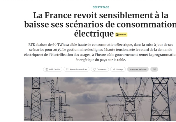 Le gestionnaire du réseau table désormais sur une demande comprise entre 470 et 510 TWh en 2030 puis 505 à 580 TWh en 2035. RTE constate donc un ralentissement de l'électrification à la fois conjoncturel et structurel. » L'efficacité et la sobriété compenseraient l'électrification. Lien Révolution Energétique ; lien Les Echos