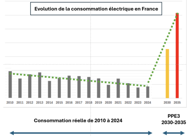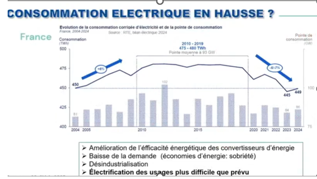 C'est l'Académie des Sciences qui a jeté, lors de sa contribution sur la PPE3, le premier pavé dans la mare pour un moratoire sur les ENR : Il est incompréhensible que les objectifs de production électrique totale ne tiennent pas compte, à travers des scénarios alternatifs, de la réalité suivante : depuis 2017, la consommation électrique diminue globalement, passant de 480 à 449 TWh en 2024, en contradiction avec les prévisions… Avec des besoins en électricité de 508 TWh en 2035, aucune capacité supplémentaire de production électrique ne serait alors nécessaire, la production actuelle étant suffisante. Pourquoi, alors, envisager 200 TWh d'énergies renouvelables (EnR) supplémentaires… Plus inquiétant encore, cette production repose principalement sur une augmentation massive des énergies solaire et éolienne intermittentes, passant de 73 TWh en 2023 à 254-274 TWh en 2035. Cette évolution entraînerait des surcapacités considérables, coûteuses et inutiles. lien